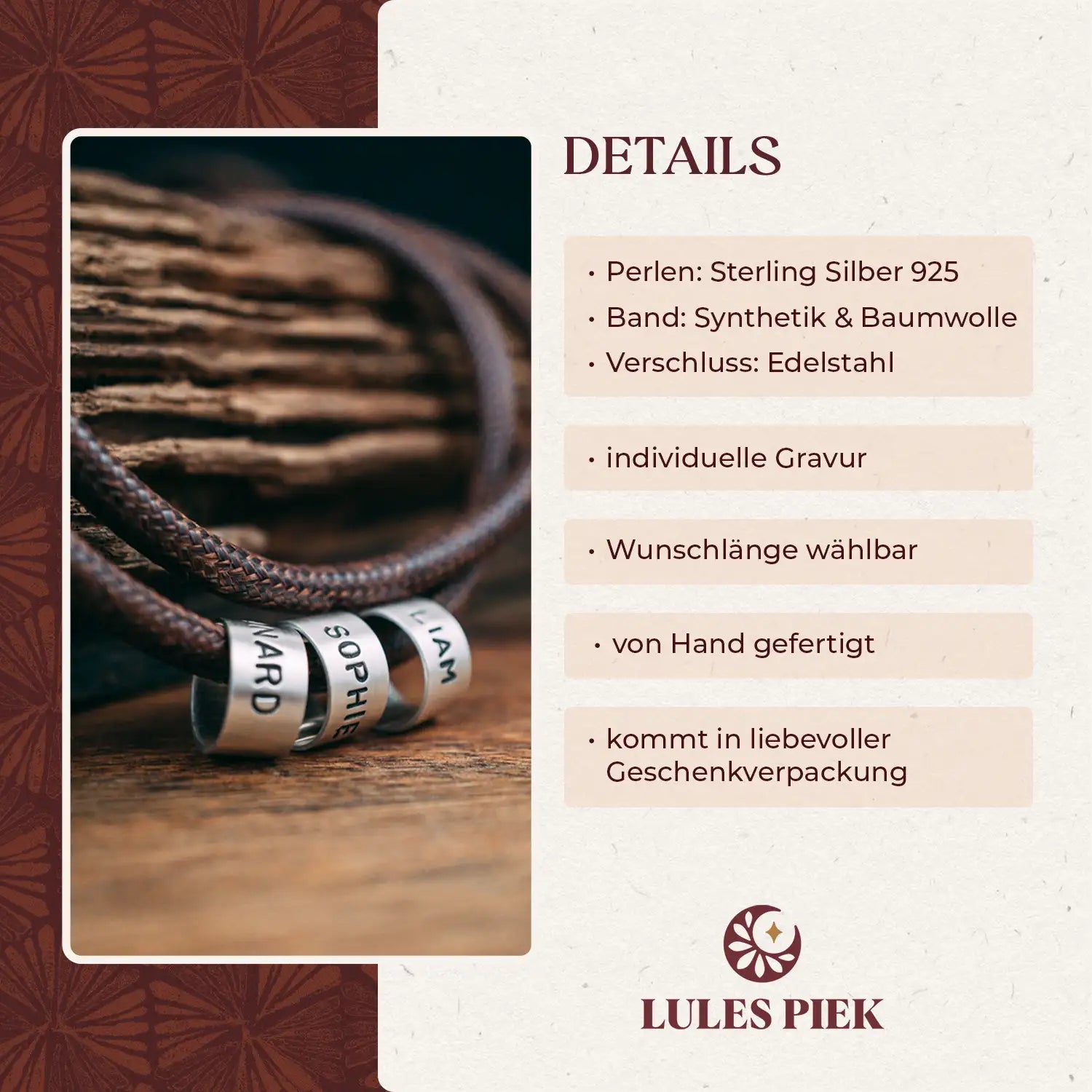 Eine Namenskette in rustikal dunklem Antikbraun, geziert von matt polierten Echtsilberperlen mit den Namen der Liebsten, einem Datum oder Worten, die dir etwas bedeuten!