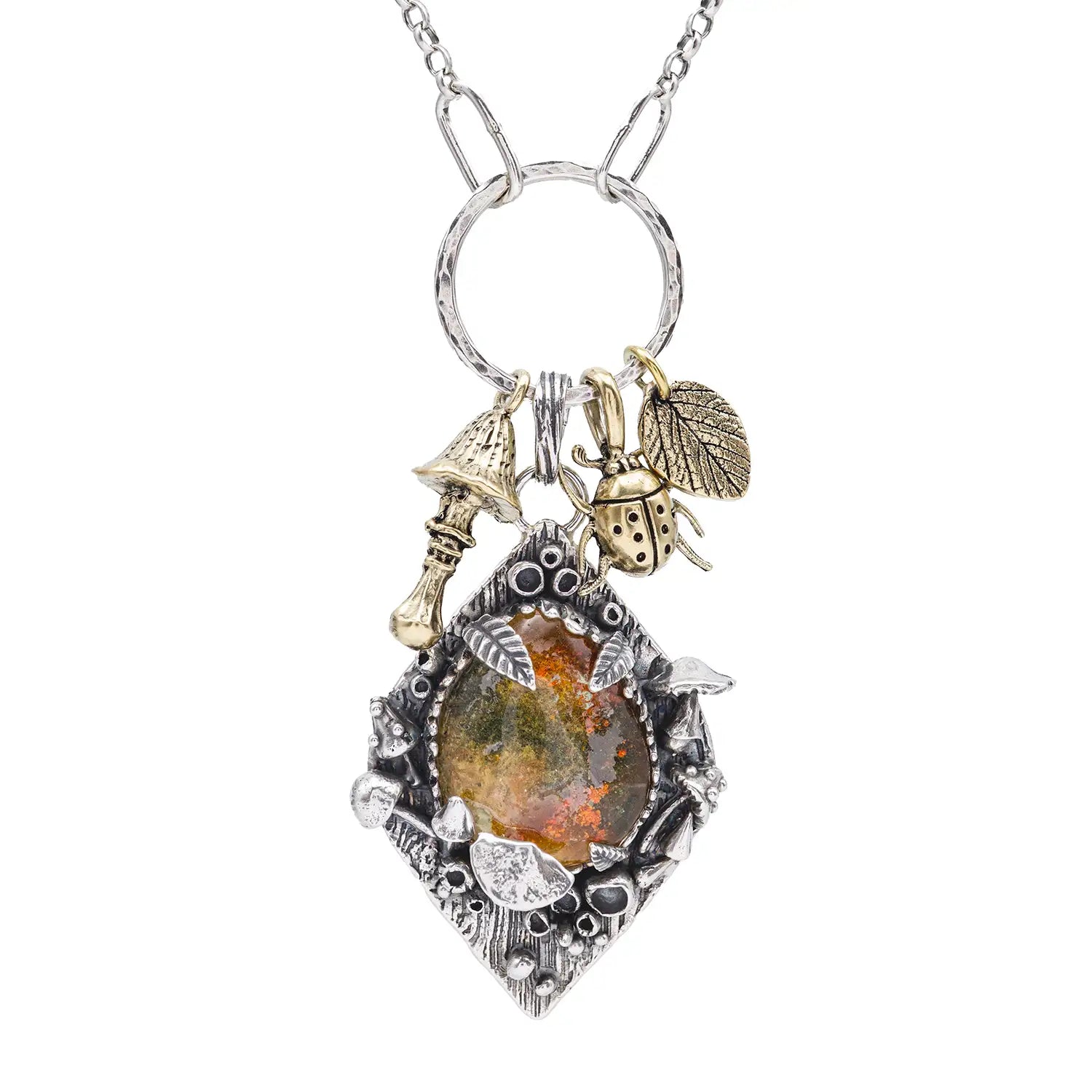 Wortwörtlich ein Waldspaziergang! Der große Anhänger ist handgefertigt aus 925er Silber, blattförmig geschmiedet, mit einer Rindentextur, die sich anfühlt wie ein Stück Wald in der Hand. Im Zentrum ruht ein Gartenquarz – auch Lodolit genannt – mit moosig-grünen, goldgelben und orangenen Einschlüssen. Wie festgehaltene Natur. Gefasst in Blättern, eingerahmt von Pilzen und Knospen – ein stilles Kunstwerk.