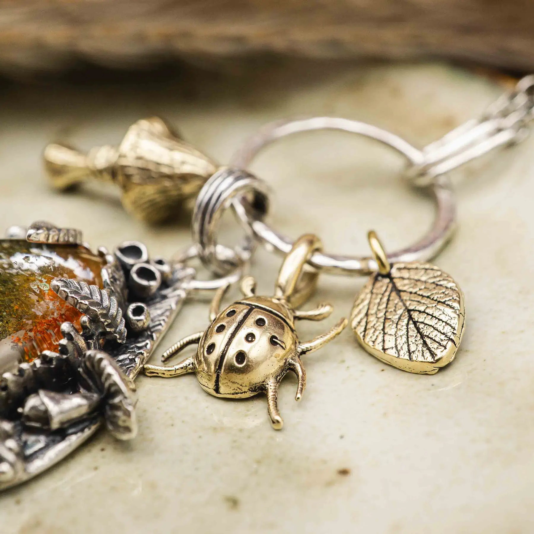 - Handmodellierte Cluster Charm Anhänger aus Messing: Pilz, Blatt und Marienkäfer