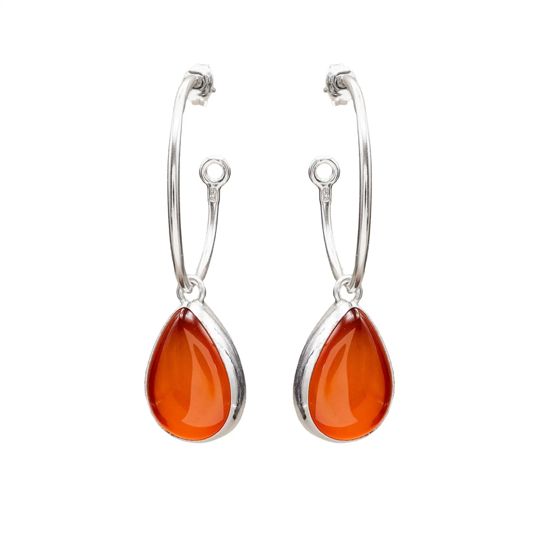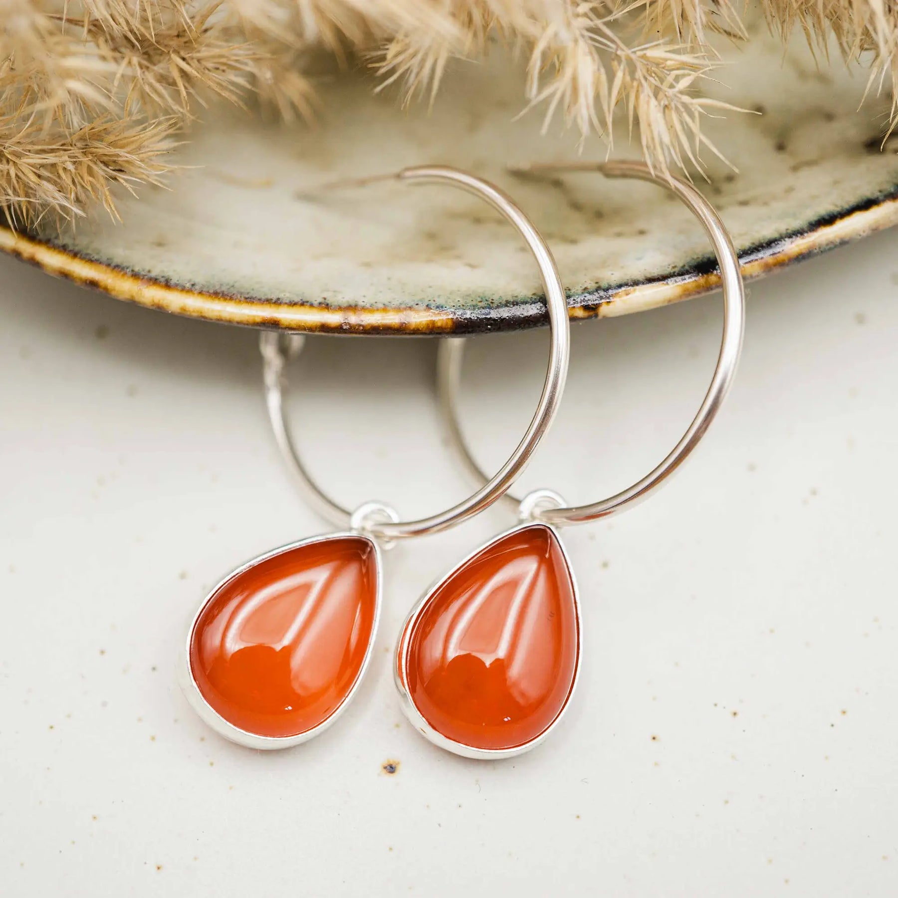 Creolen Silber 925 mit Karneol Tropfen Anhänger - handgefertigte Ohrringe aus Sterling Silber mit rotem Edelstein, 30mm Durchmesser, eleganter Statement-Schmuck.