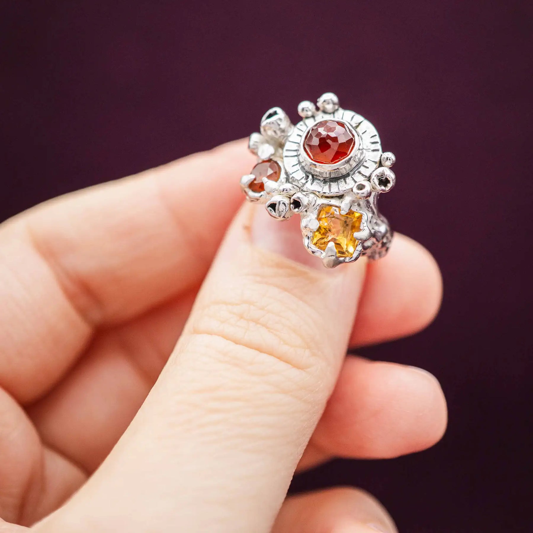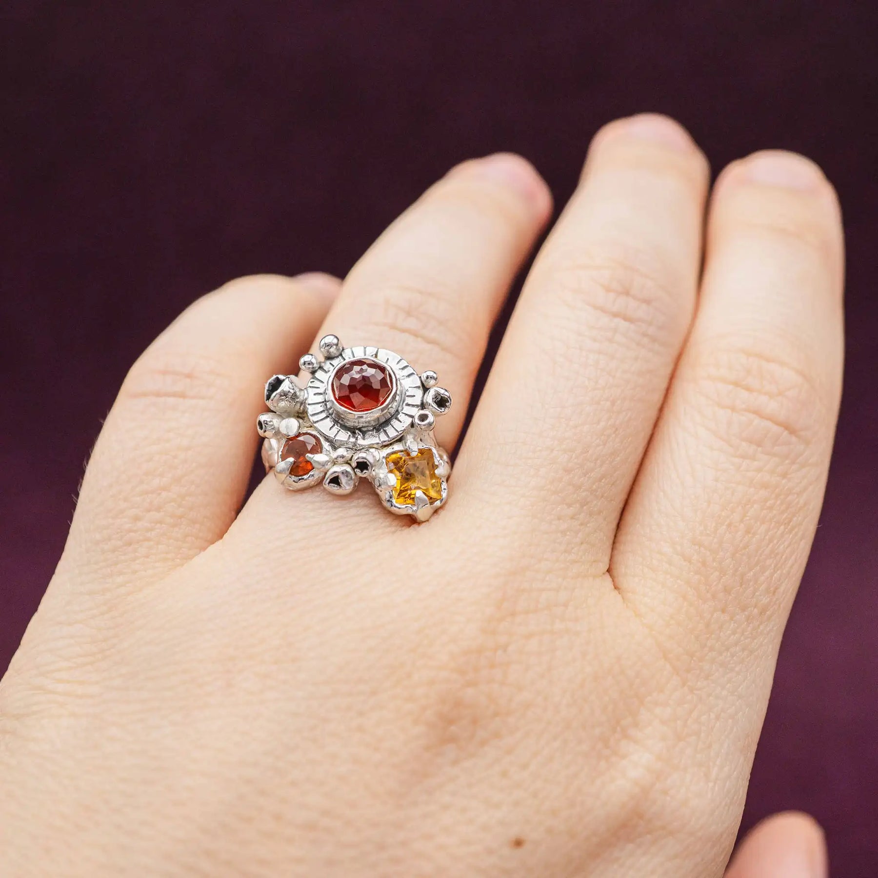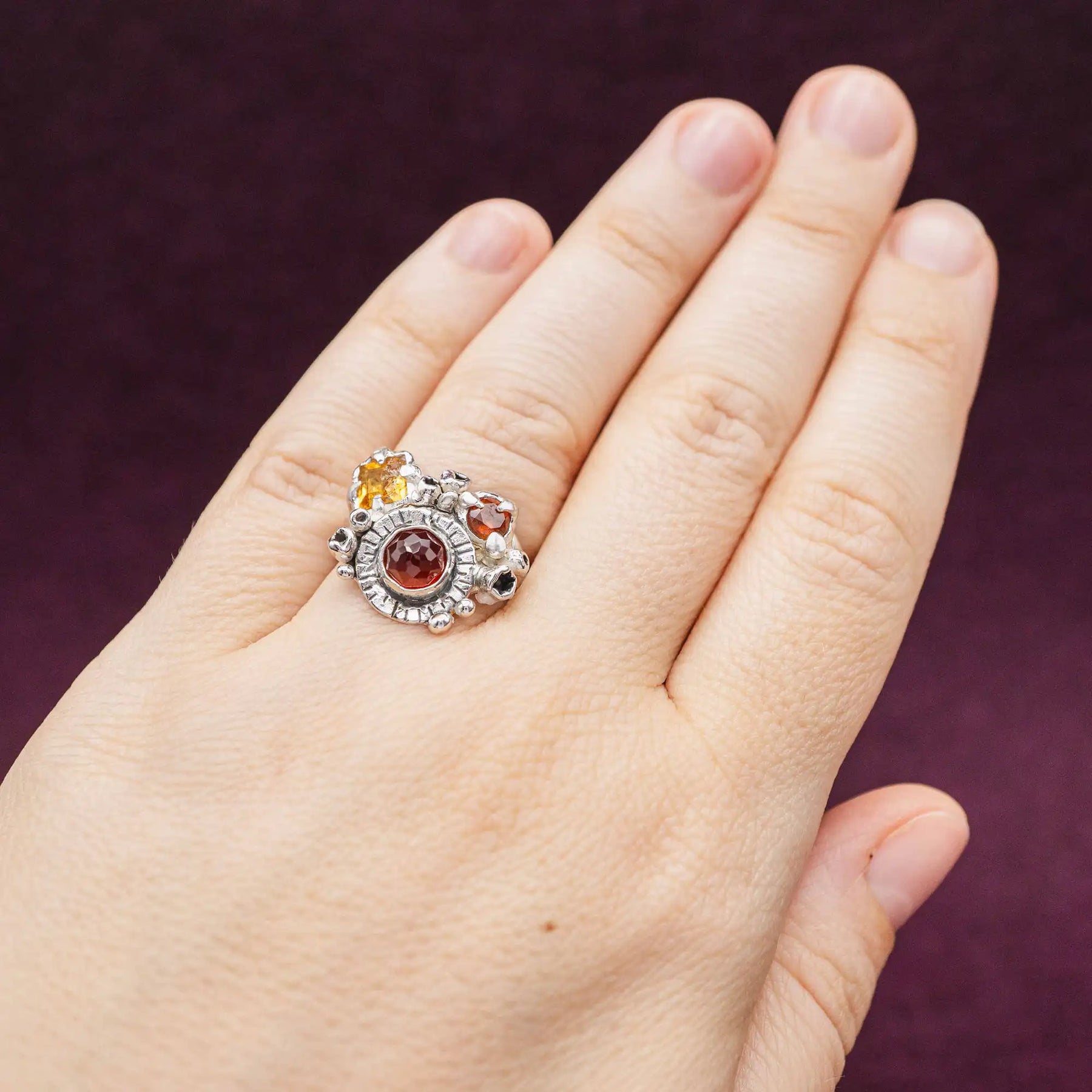 Ein Ring wie ein Sonnenuntergang in Edelsteinform. Warme Töne, die glühen wie Sommerabende: Ein tiefroter Granat, ein leuchtend oranger Hessonit-Granat und ein sonnengelber Citrin tanzen in diesem handgefertigten Silberring miteinander – wie ein wilder, leuchtender Blumenstrauß am Finger.