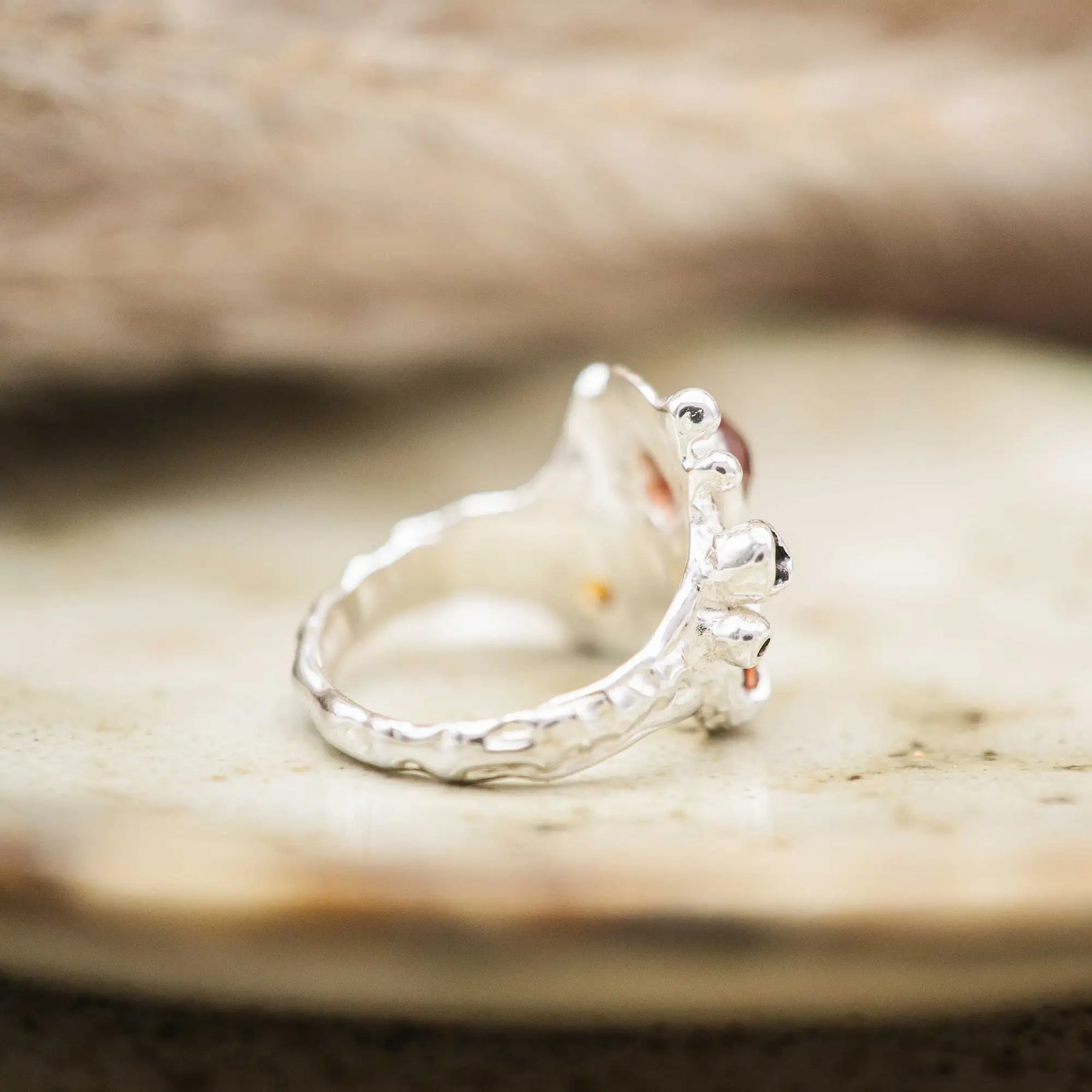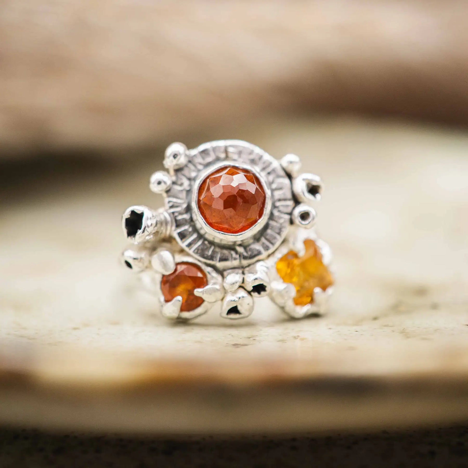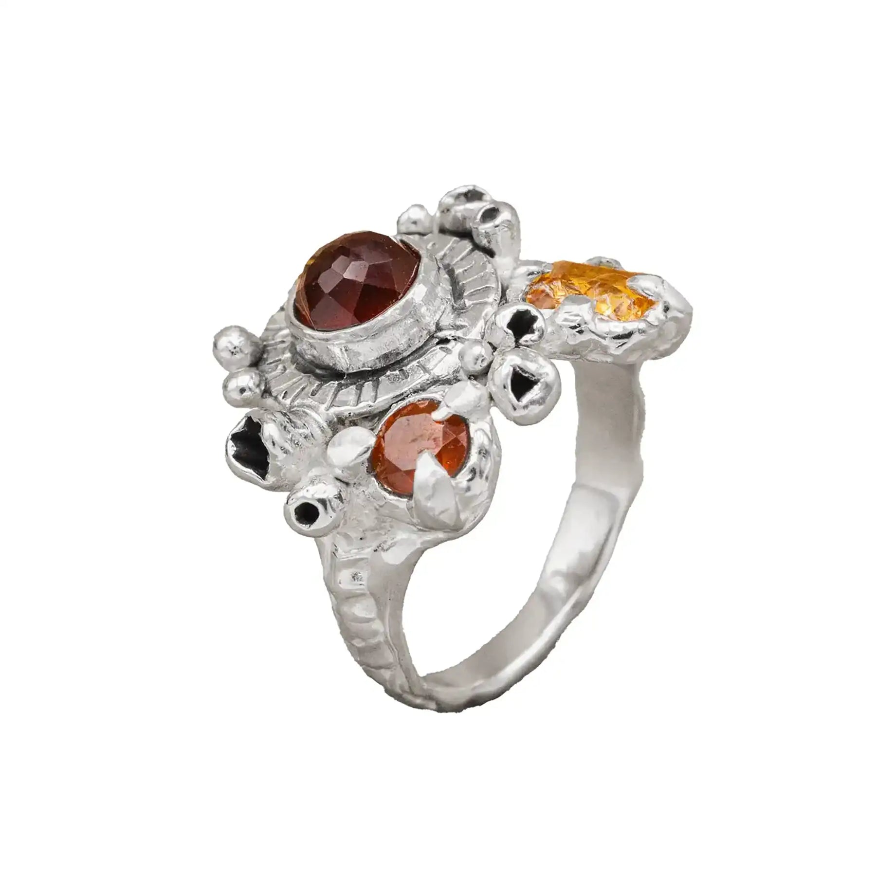 Ein Ring wie ein Sonnenuntergang in Edelsteinform. Warme Töne, die glühen wie Sommerabende: Ein tiefroter Granat, ein leuchtend oranger Hessonit-Granat und ein sonnengelber Citrin tanzen in diesem handgefertigten Silberring miteinander – wie ein wilder, leuchtender Blumenstrauß am Finger.