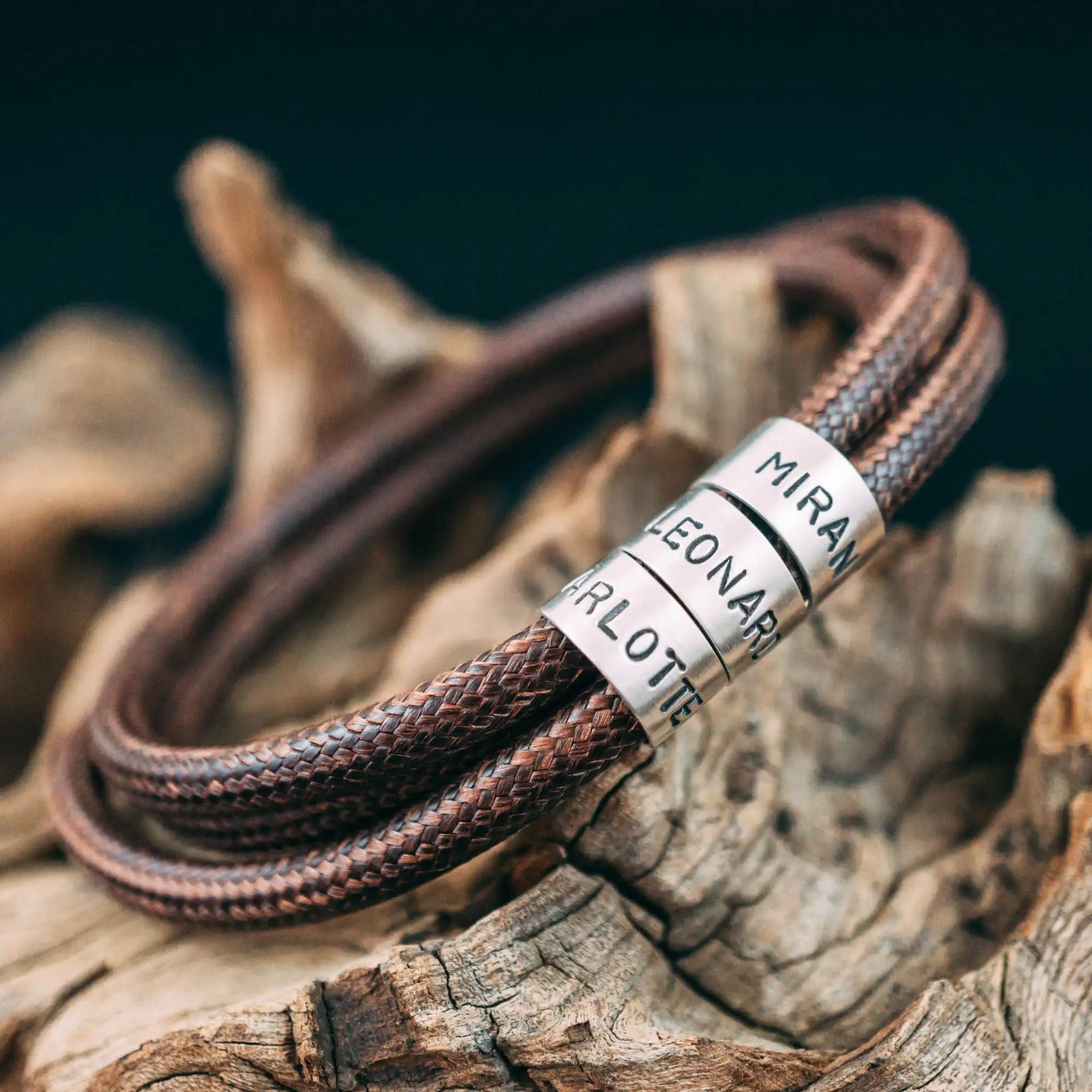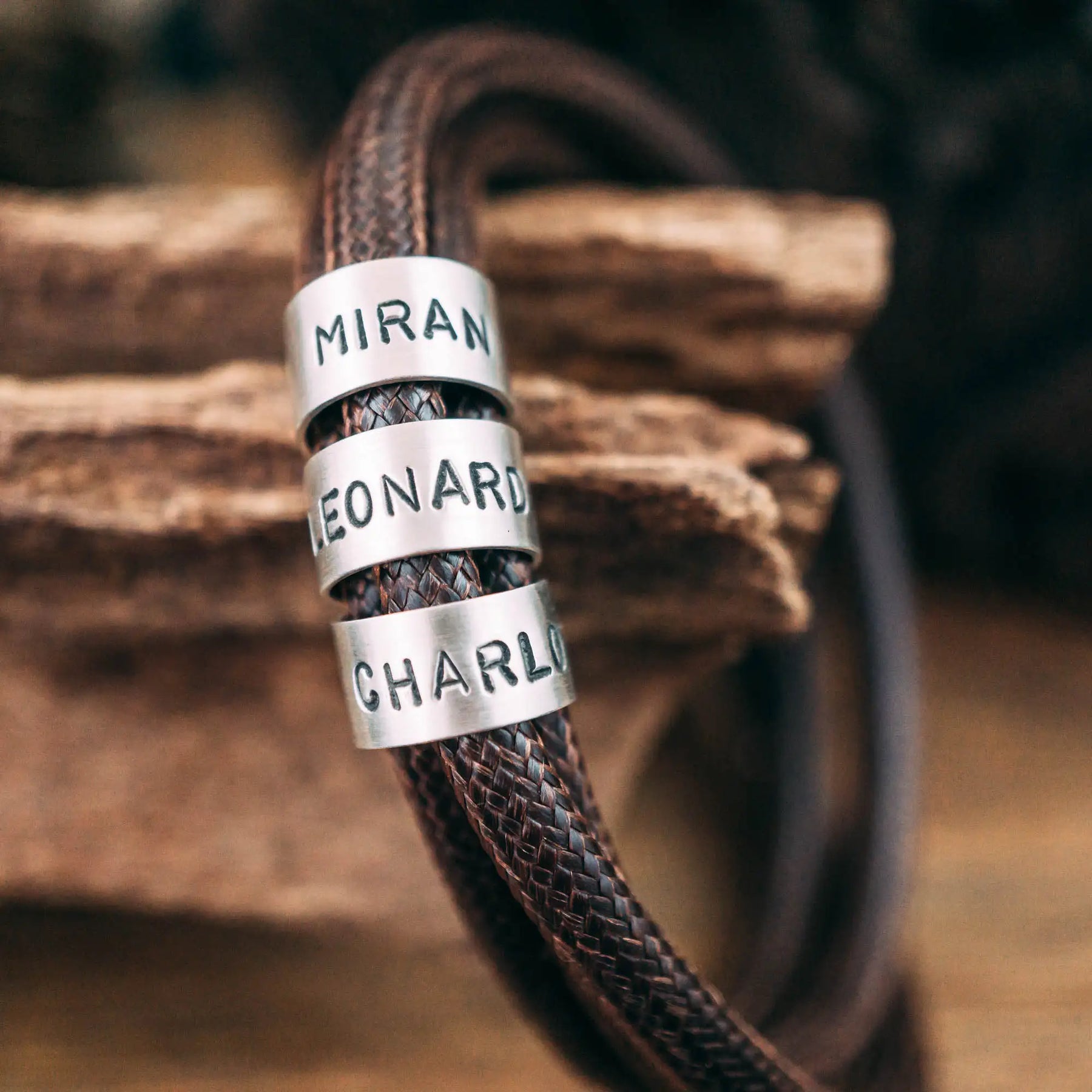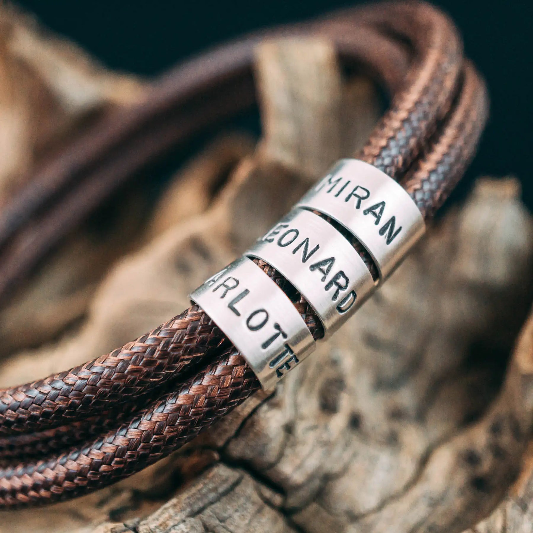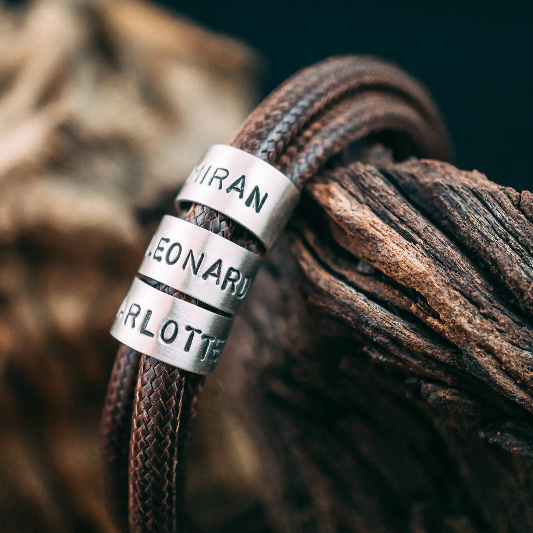 Ein Armband in rustikalem Antikbraun, geziert von matt polierten Echtsilberperlen mit den Namensgravuren der Liebsten!