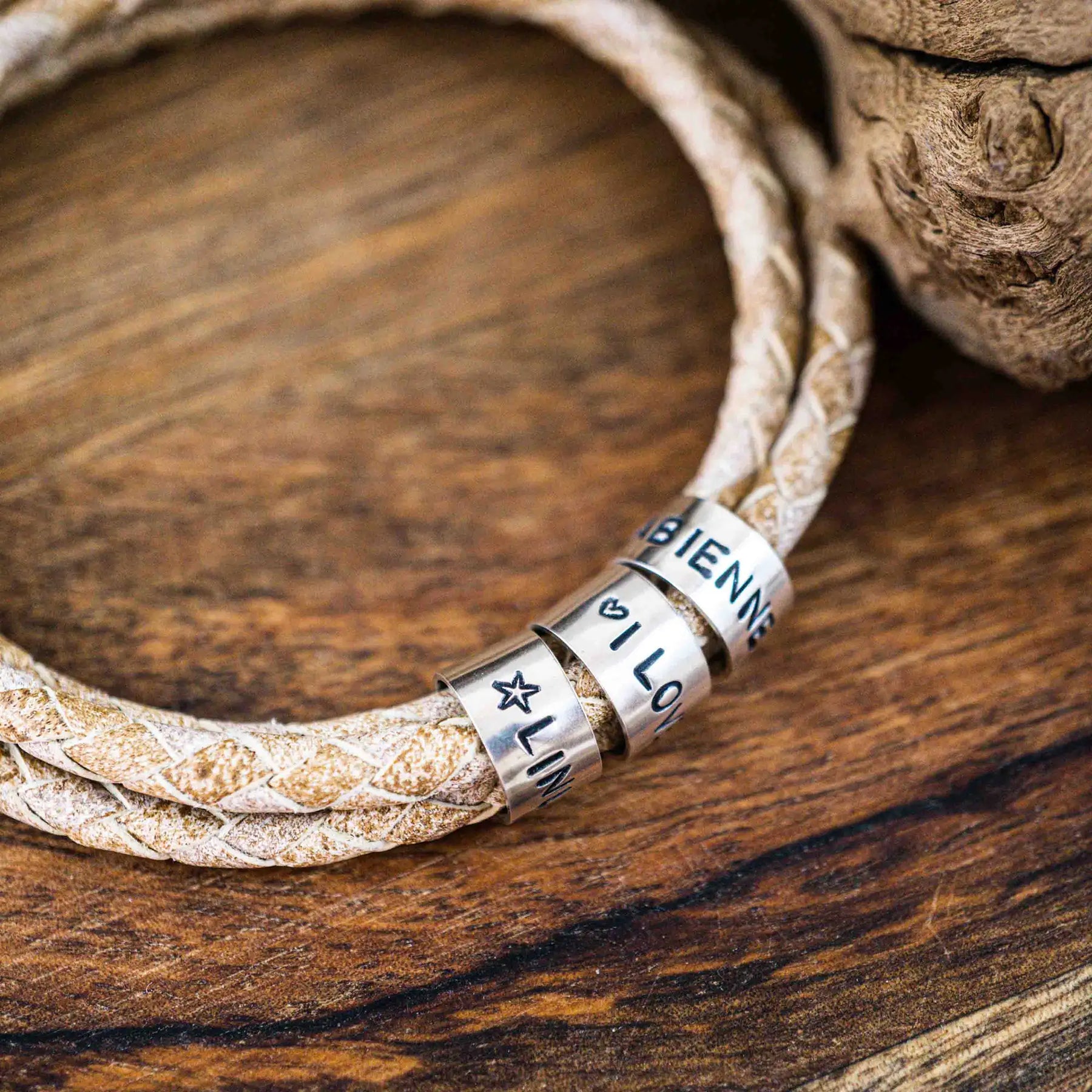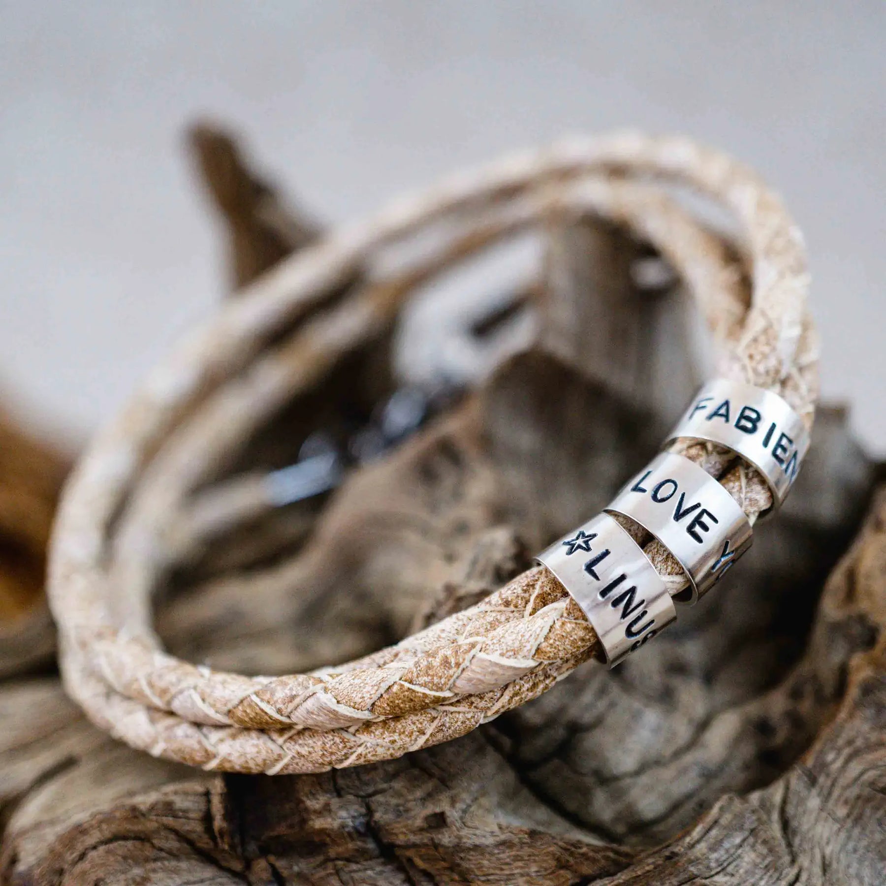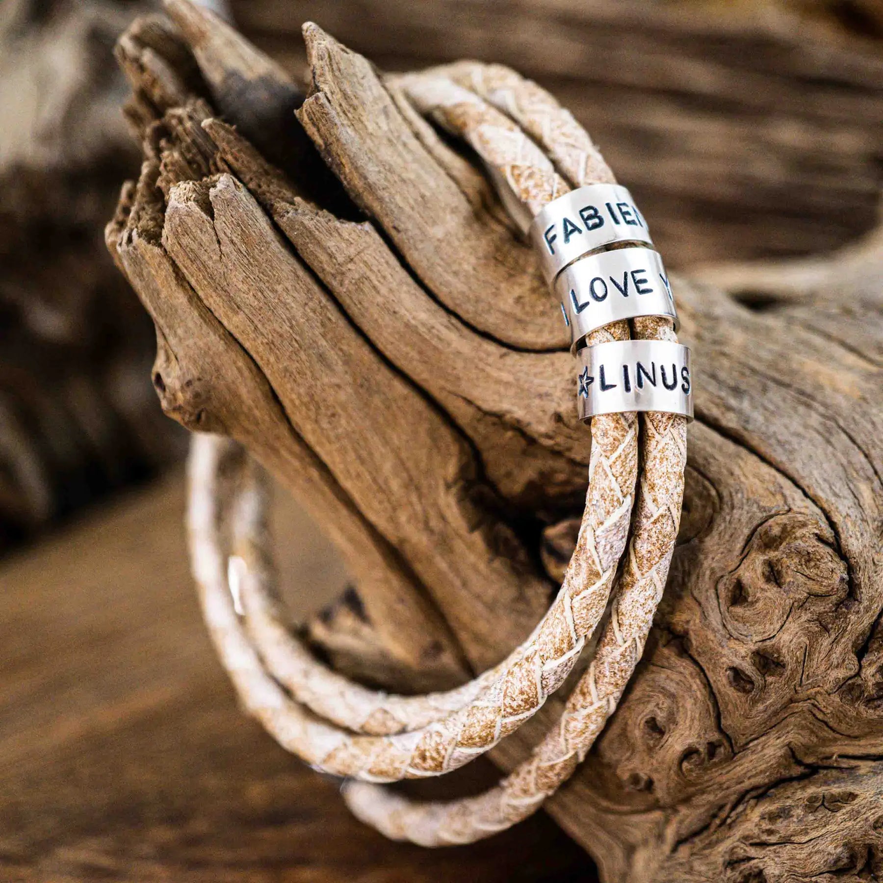 Ob die Namen deiner Liebsten, deiner Haustiere oder einfach ein Spruch, der dich inspiriert - alles findet Platz auf dem gravierten Wickelarmband aus Leder.