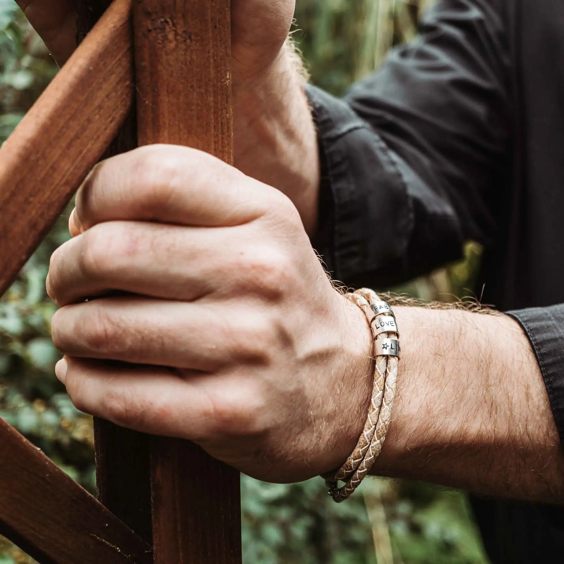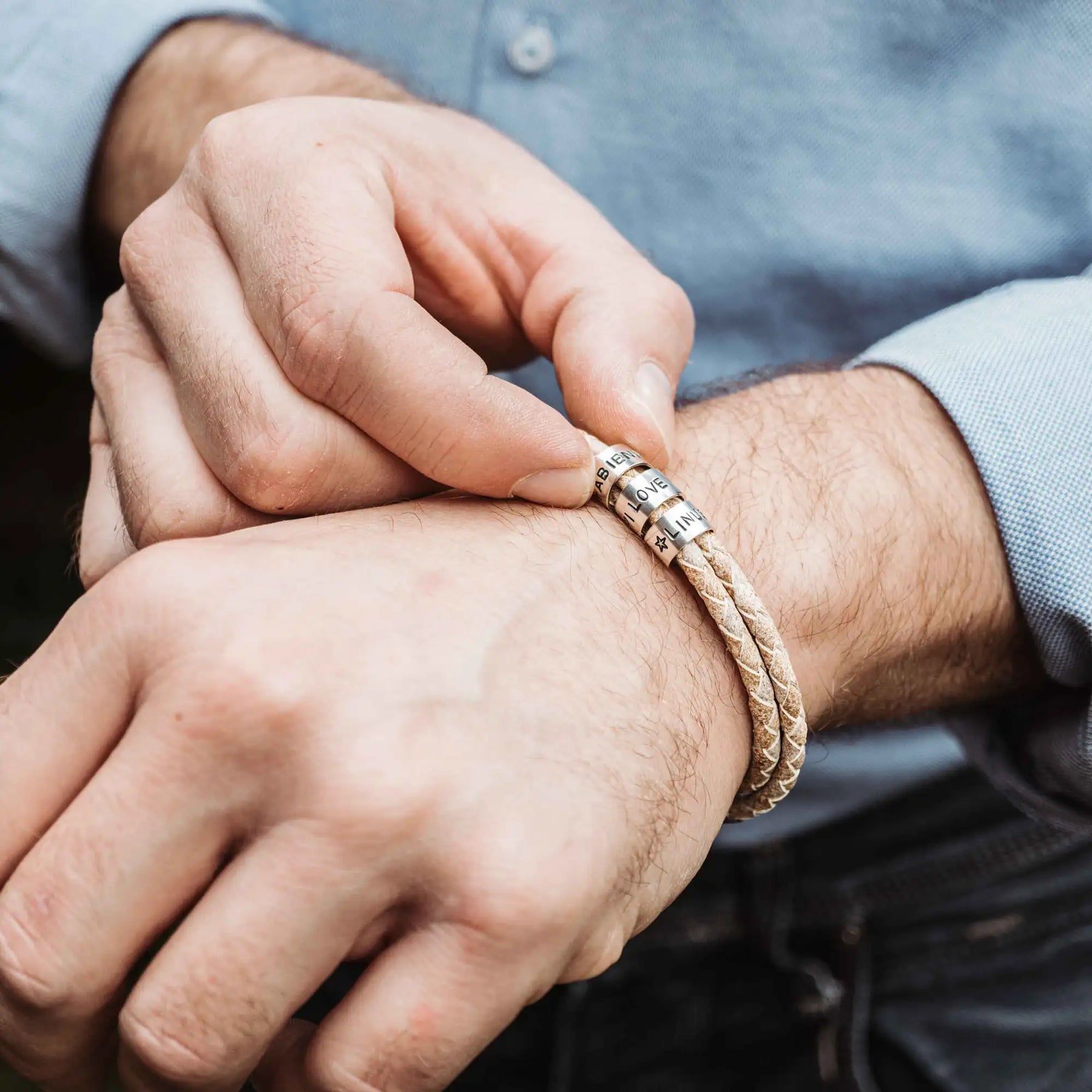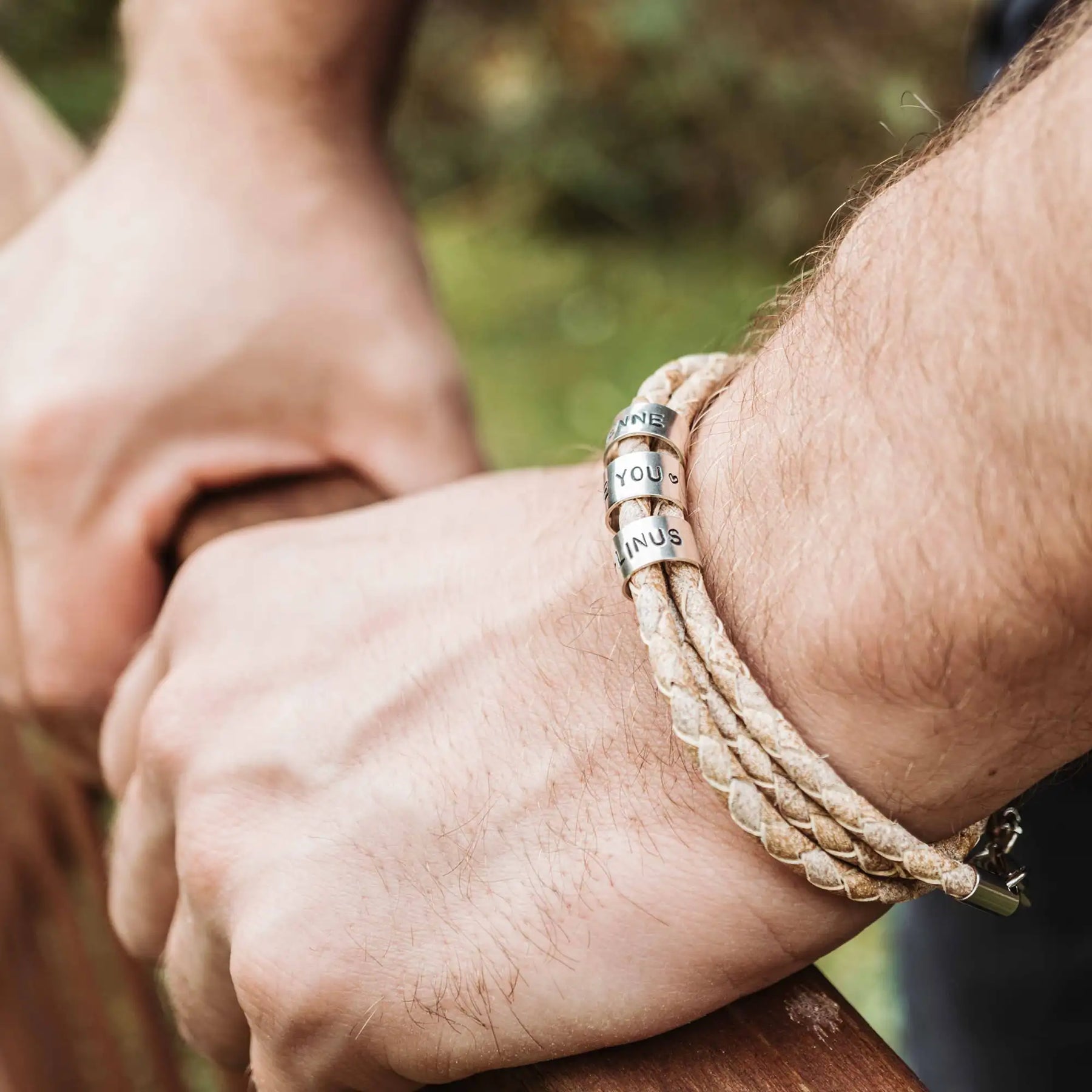 Ob die Namen deiner Liebsten, deiner Haustiere oder einfach ein Spruch, der dich inspiriert - alles findet Platz auf dem gravierten Wickelarmband aus Leder.