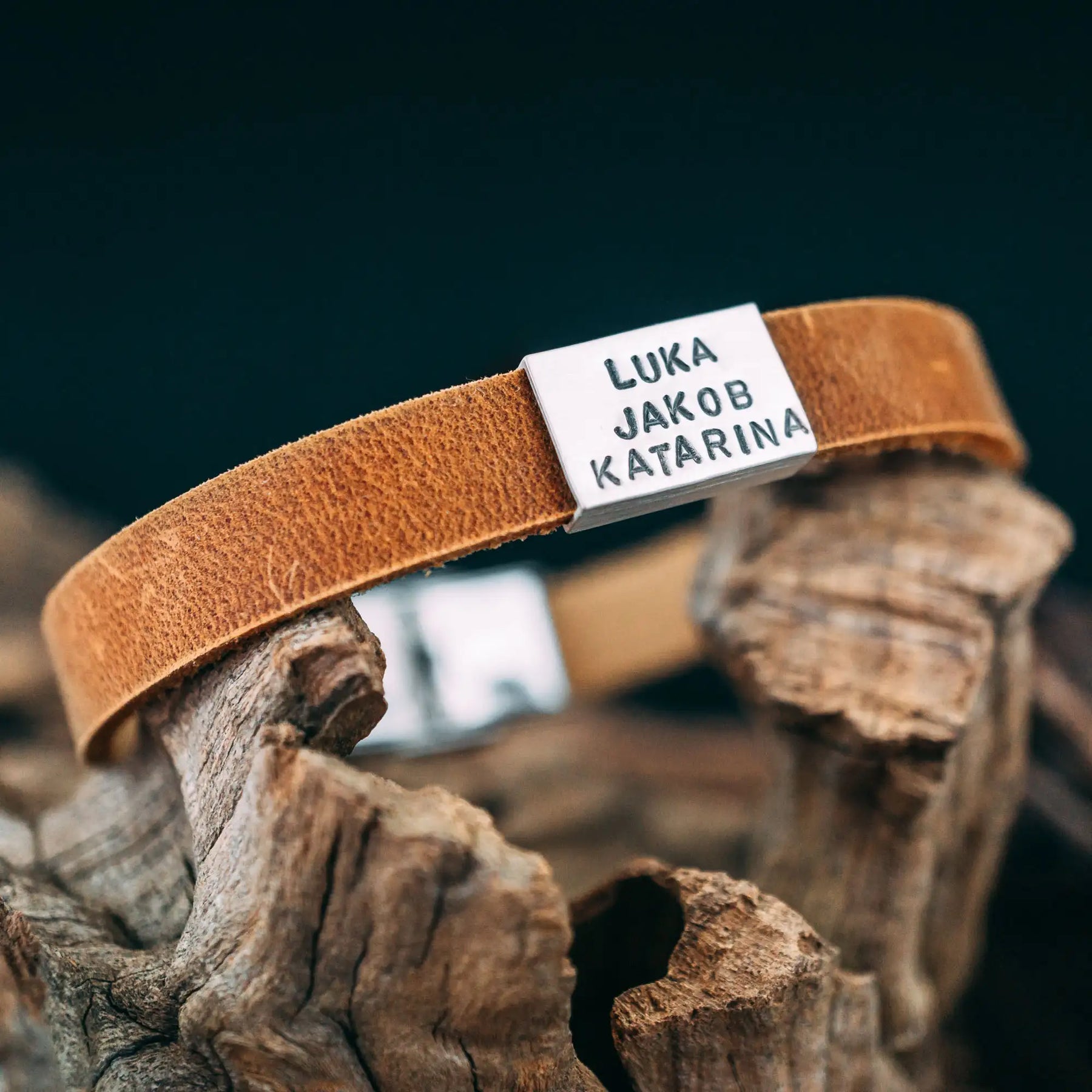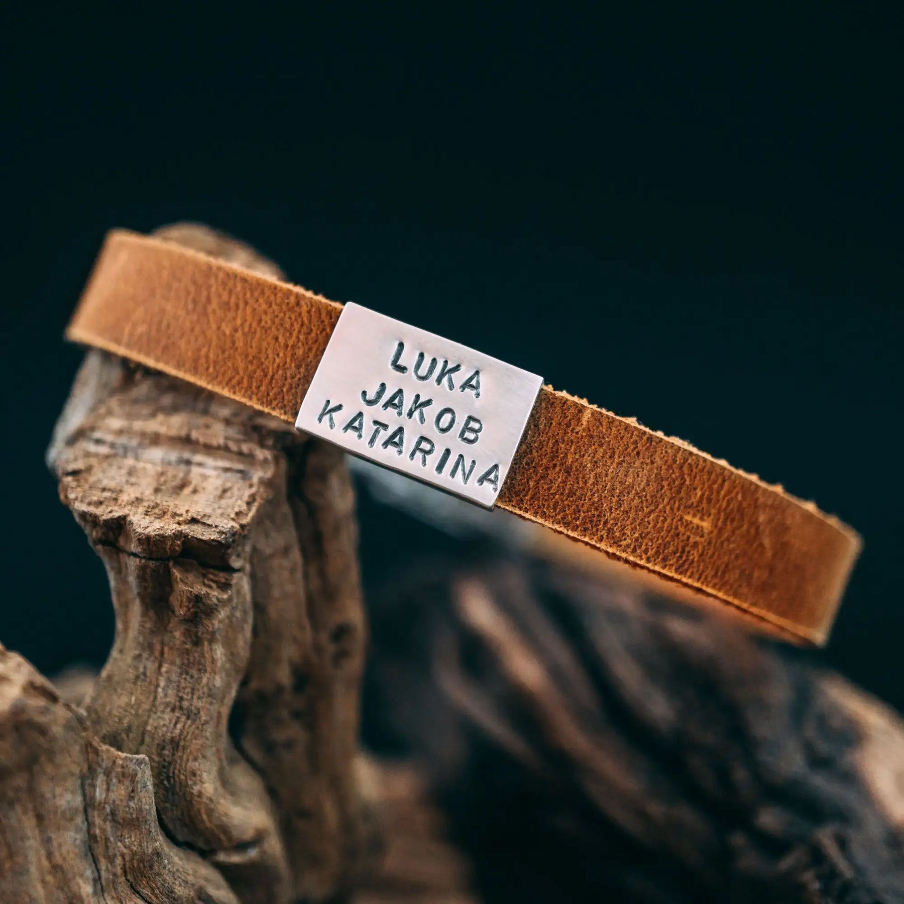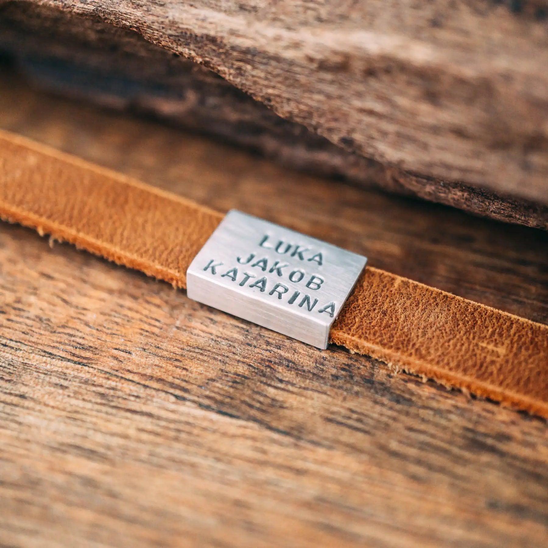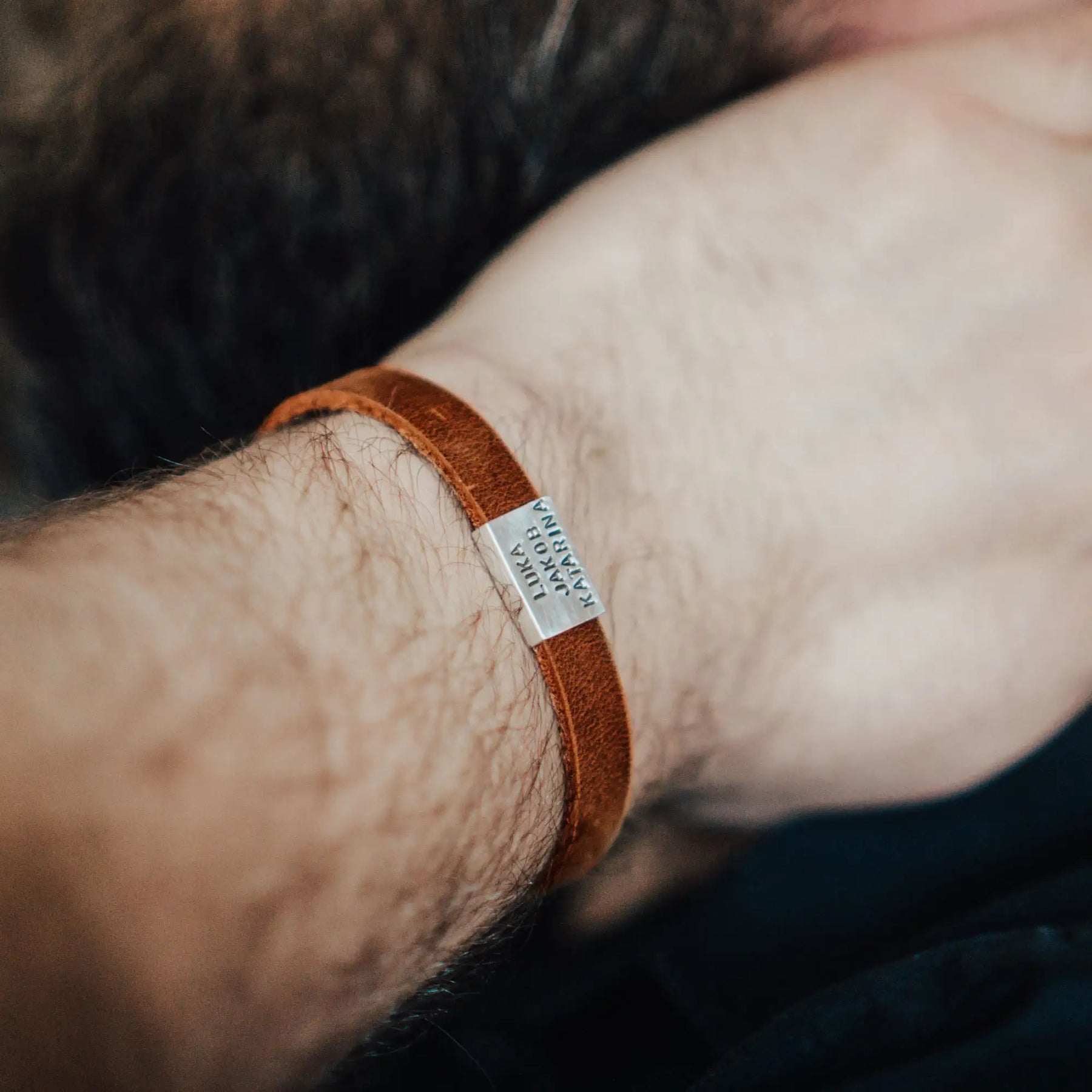 Ein Lederarmband aus kräftigem terracotta/cognac-farbenen Rindsleder, geziert von einer matt polierten Schiebeperle in 925er Echtsilber mit den Namensgravuren der Liebsten oder einem Text deiner Wahl!