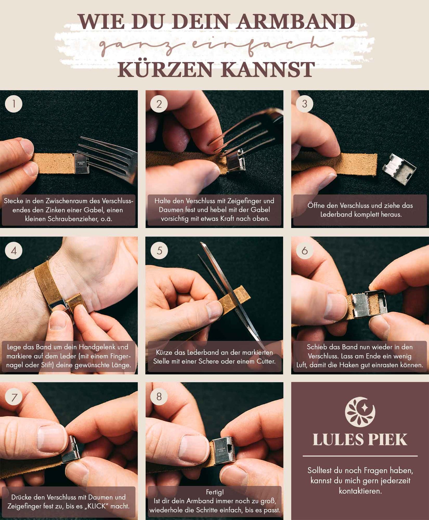 Besonders an diesem Echtlederarmband ist außerdem, dass du es ganz einfach selbst kürzen kannst! In den Produktbildern findest du eine leicht verständliche Anleitung, wie du dein Armband zu Hause mit wenigen Handgriffen auf deine Wunschgröße kürzen kannst.
