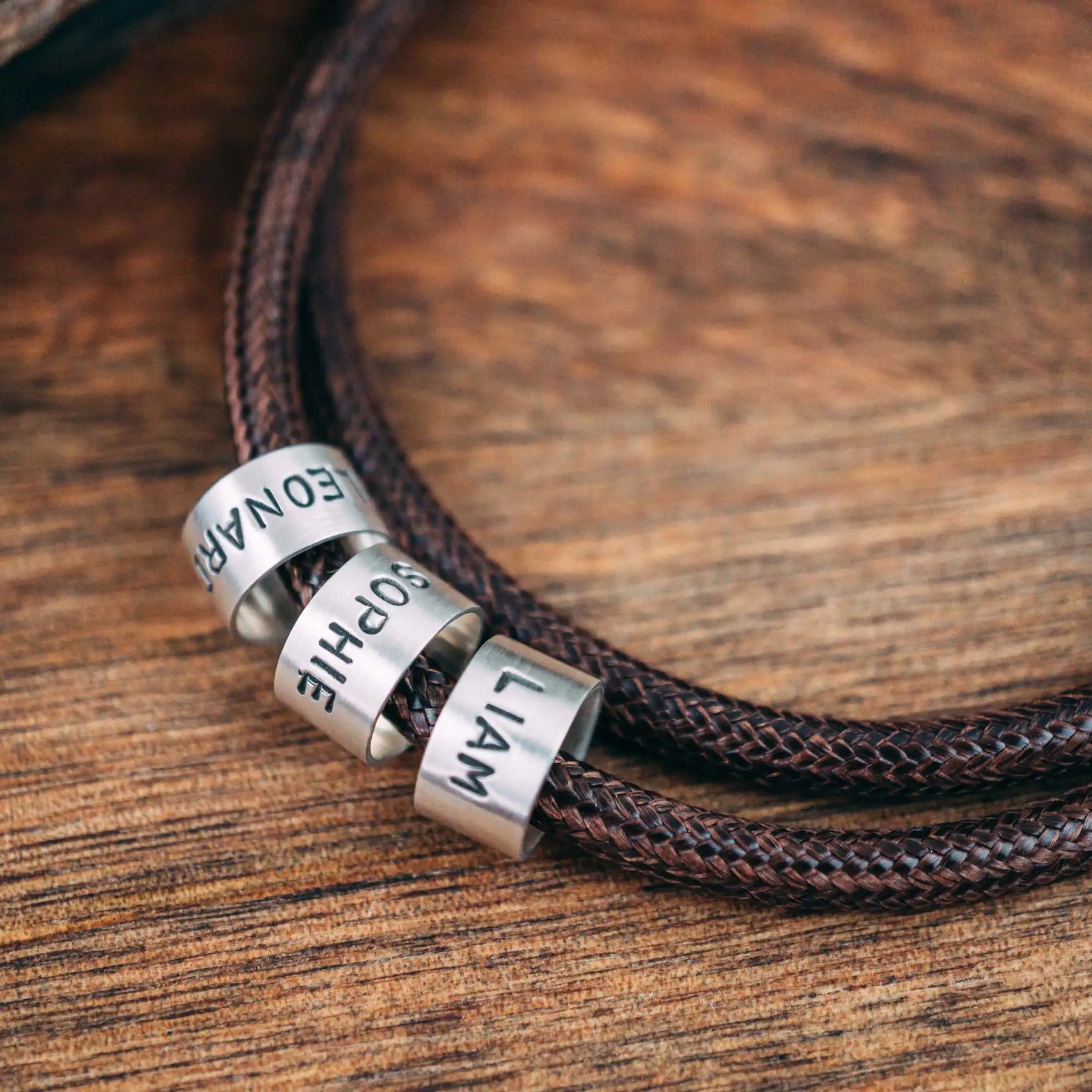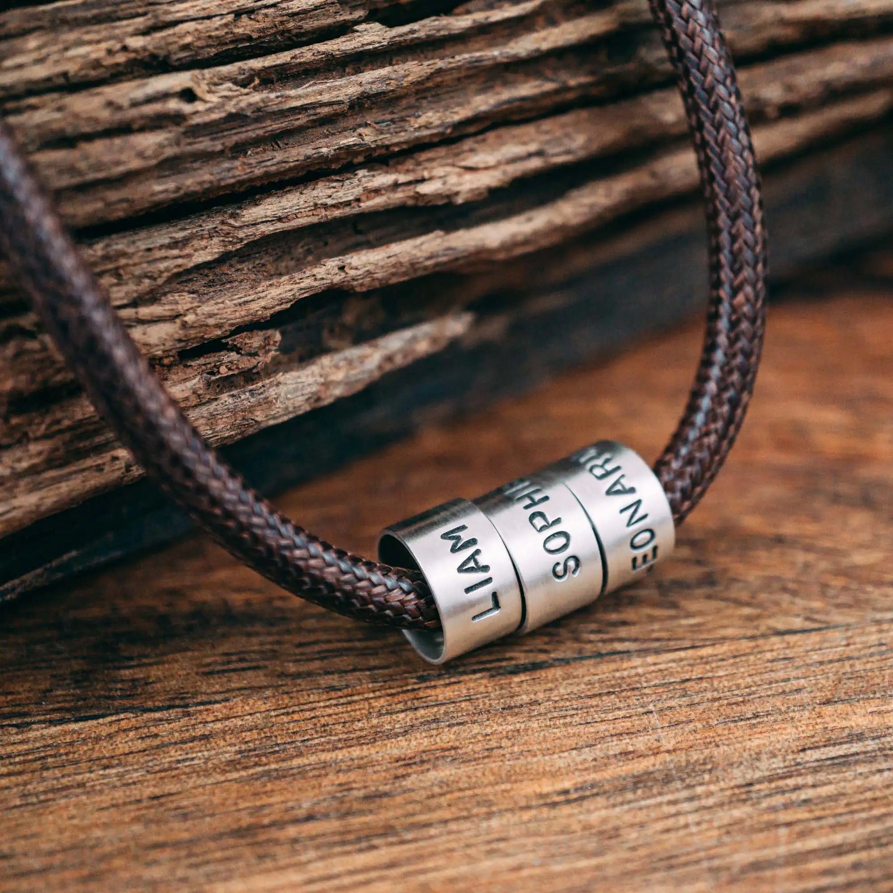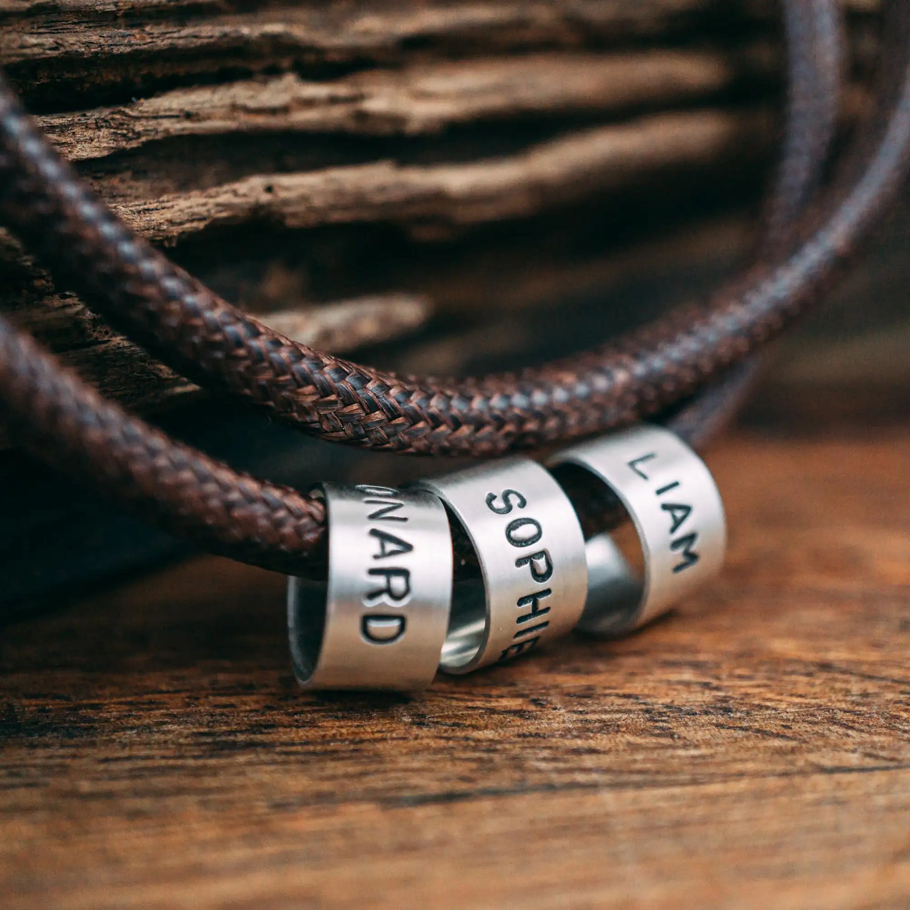 Eine Namenskette in rustikal dunklem Antikbraun, geziert von matt polierten Echtsilberperlen mit den Namen der Liebsten, einem Datum oder Worten, die dir etwas bedeuten!
