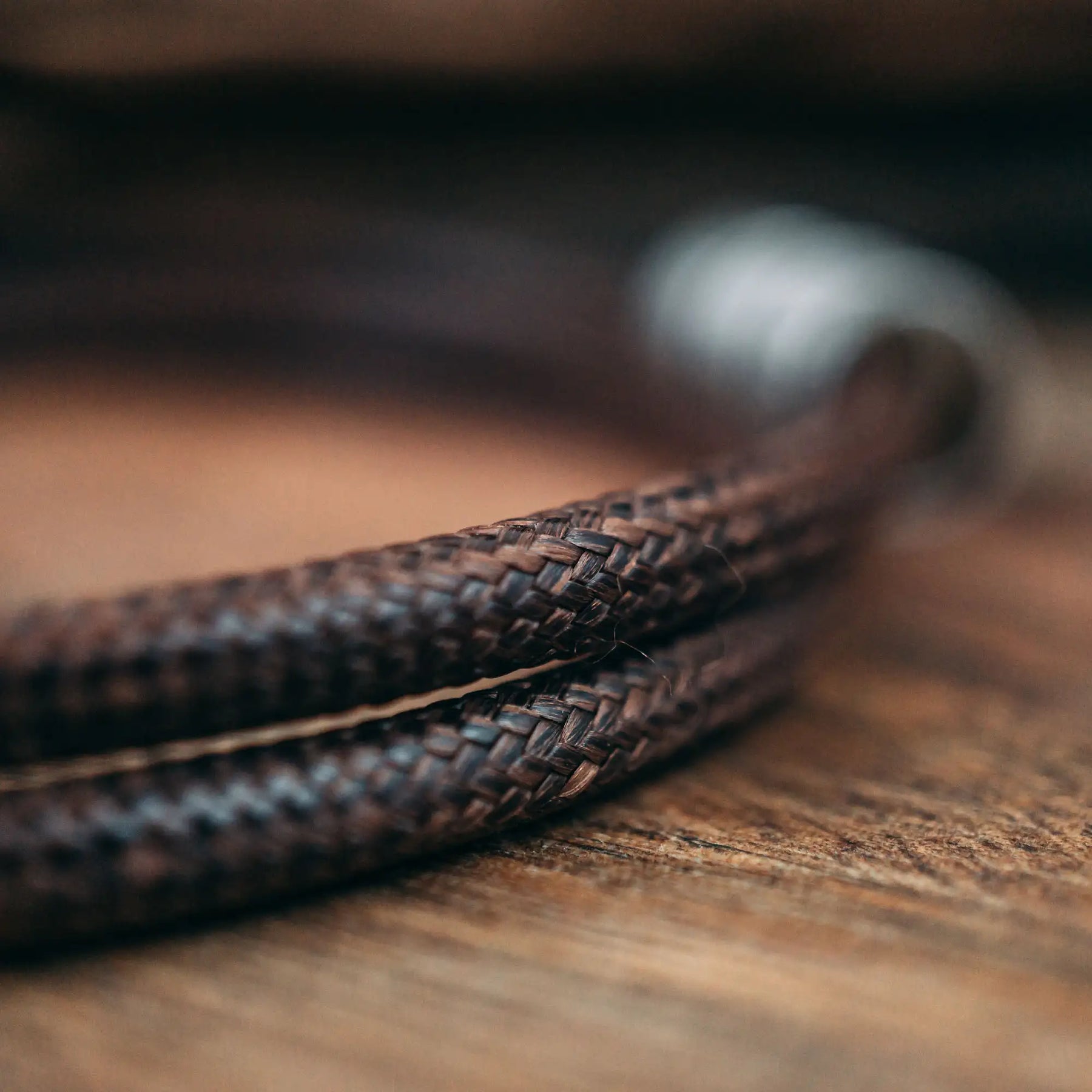 Die vegane Halskette ohne Leder besteht aus einem Baumwollkern, der mit seidig glänzender Synthetikfaser umsponnen wurde.