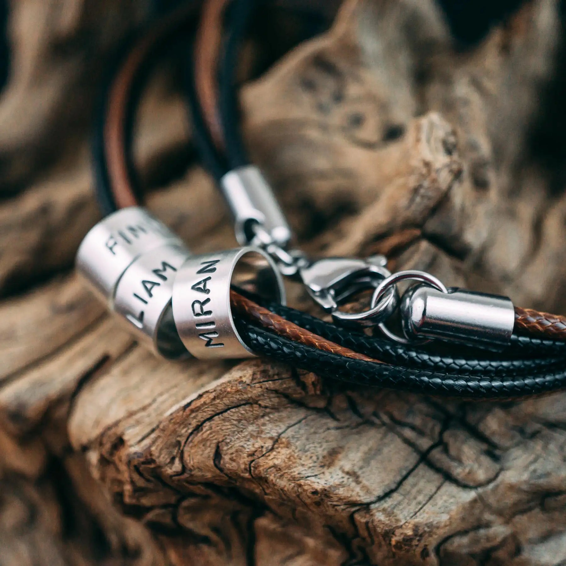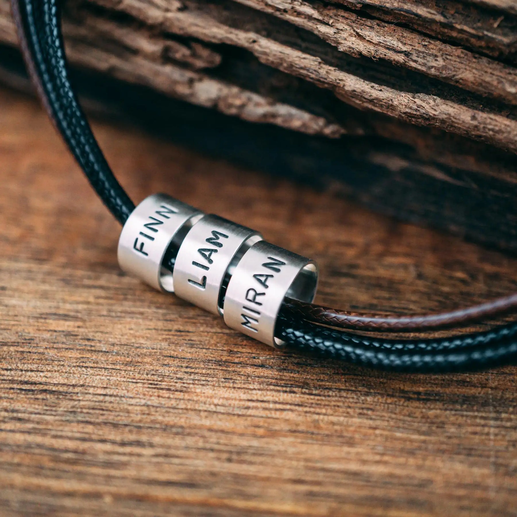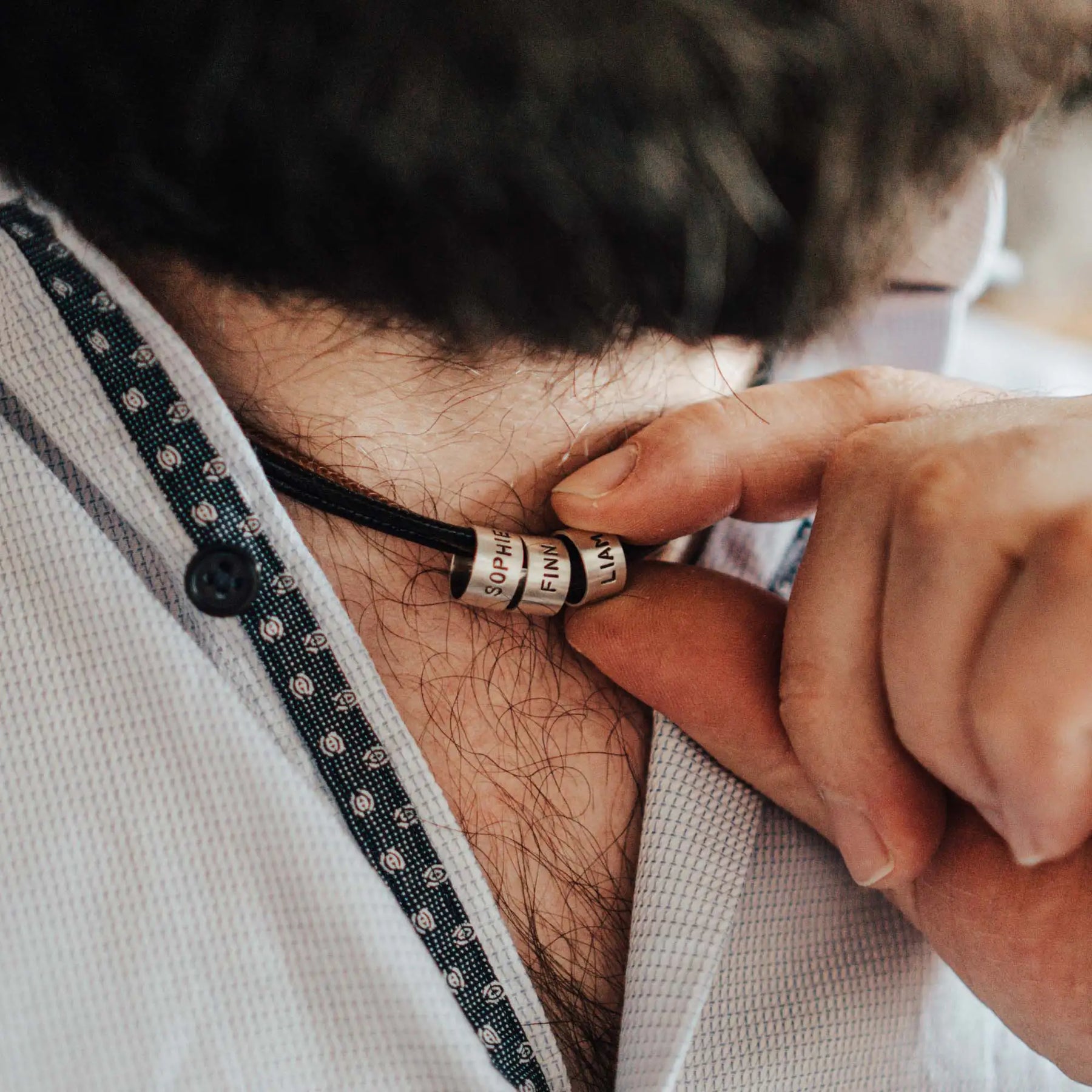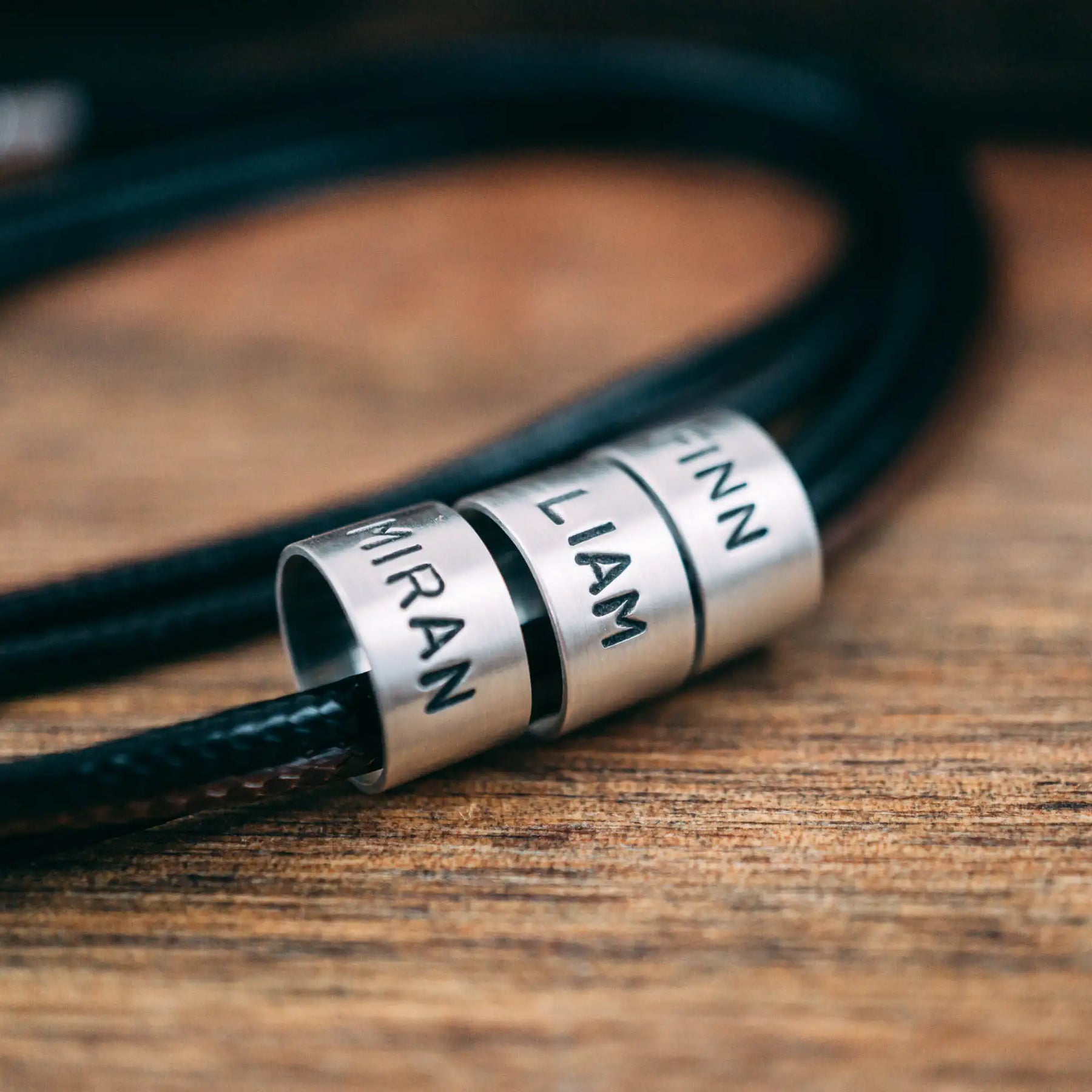 Eine Namenskette für Männer in mehrstrangigem Nachtschwarz, durchzogen von rustikalem Antikbraun und geziert von matt polierten Echtsilberperlen mit den Namen der Liebsten, einem Datum oder Worten, die dir etwas bedeuten!