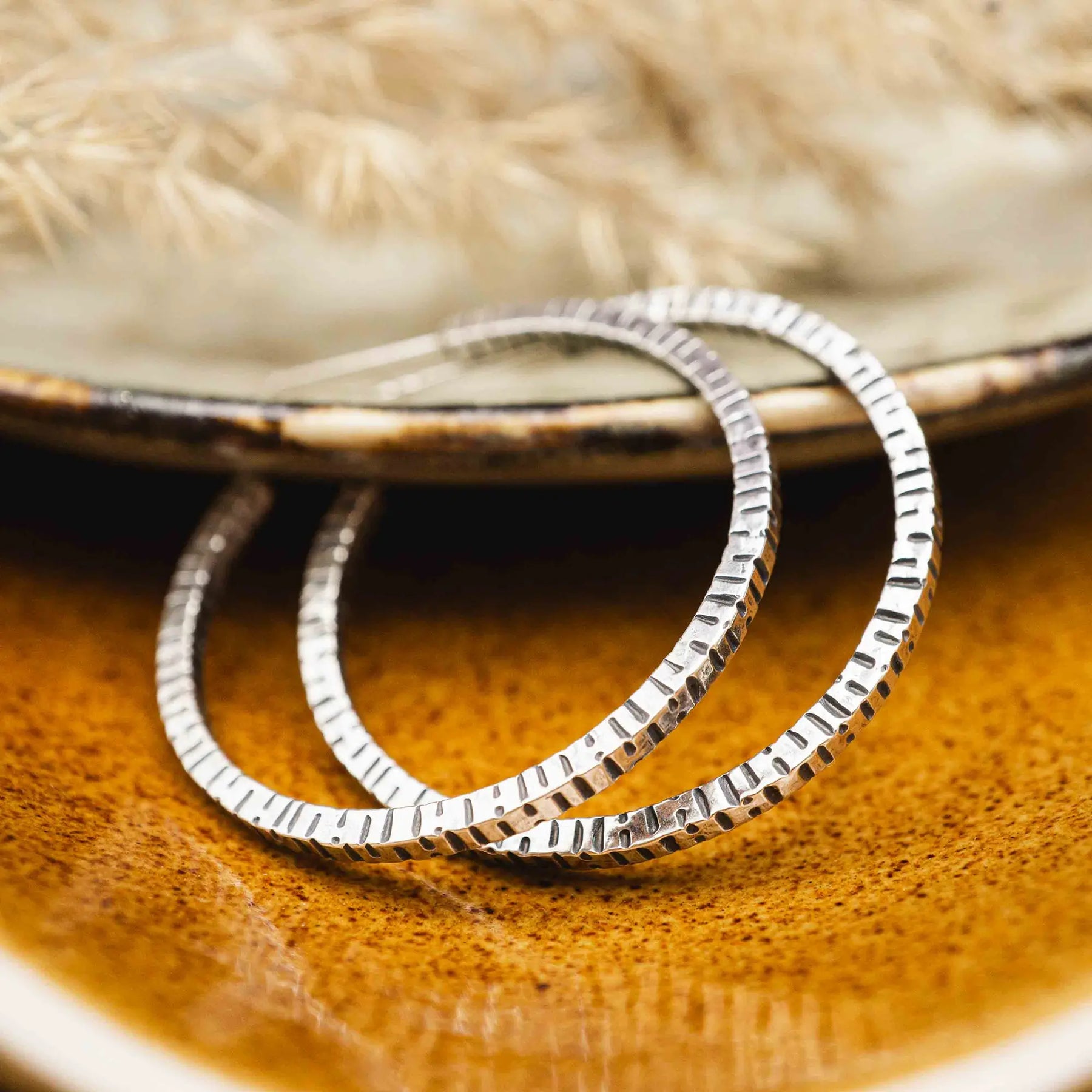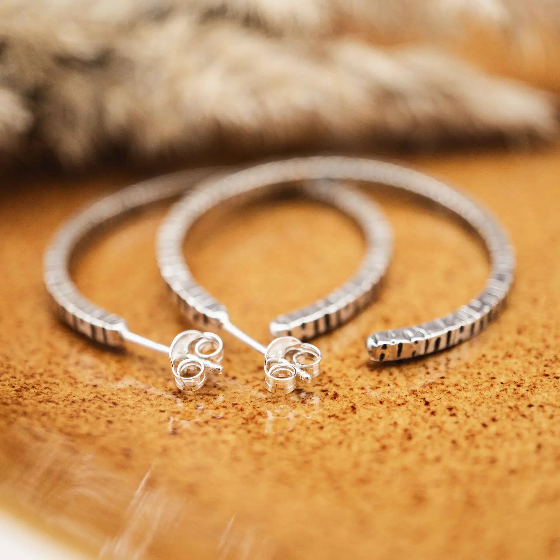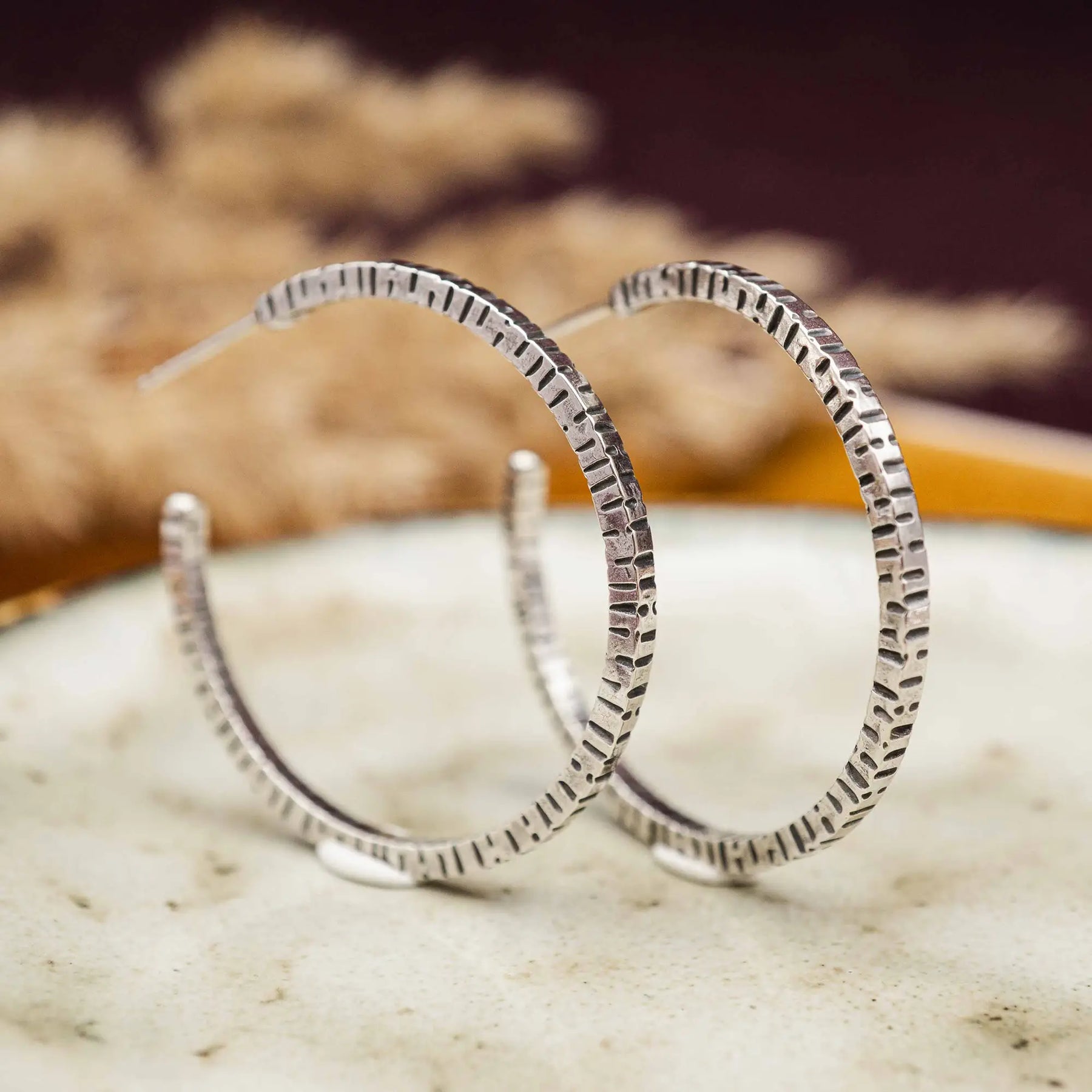 Ein klassisches Must have mit neuem Twist! Creolen Ohrringe aus 925 Silber – handgefertigt und mit einer rustikalen Birkenrinden-Textur versehen.