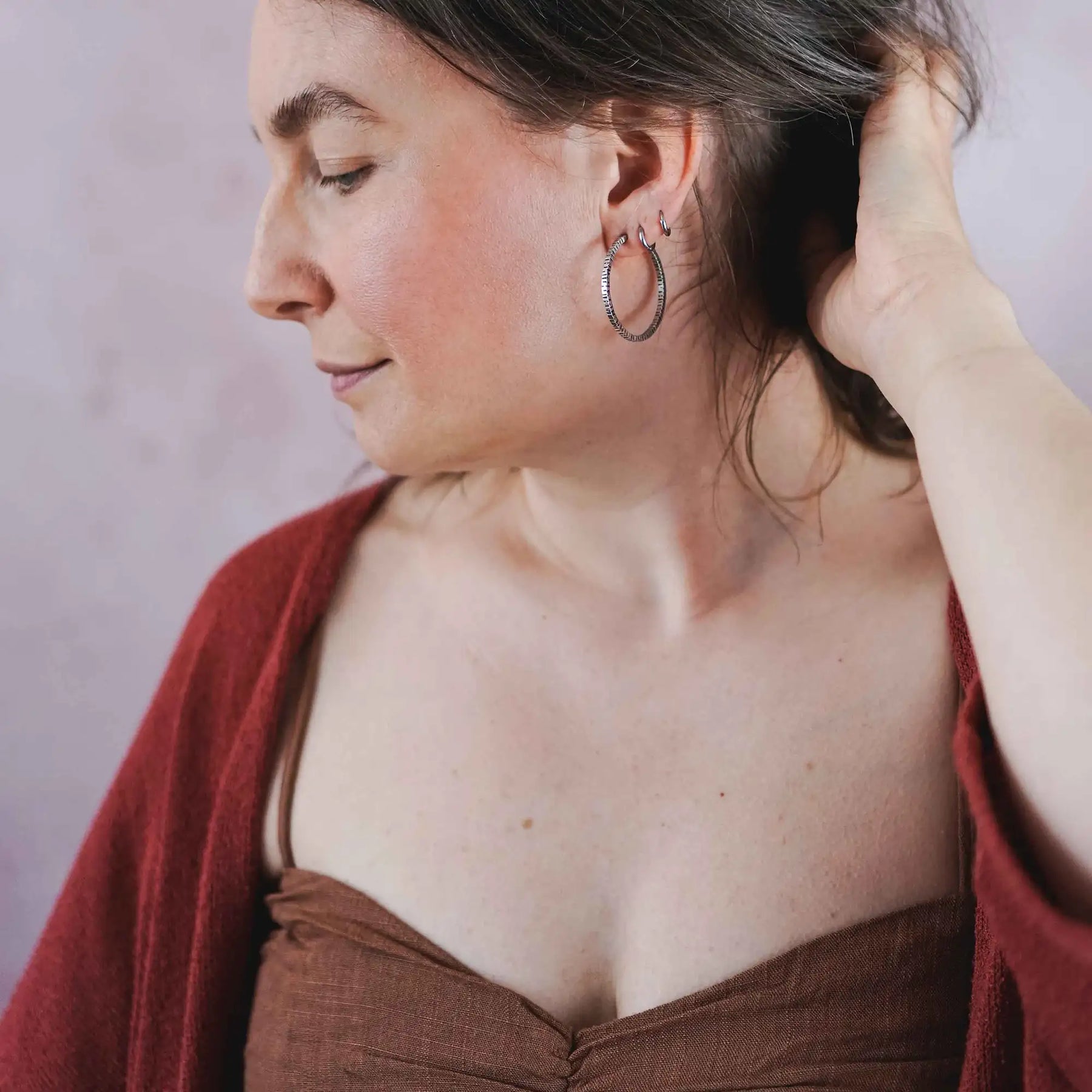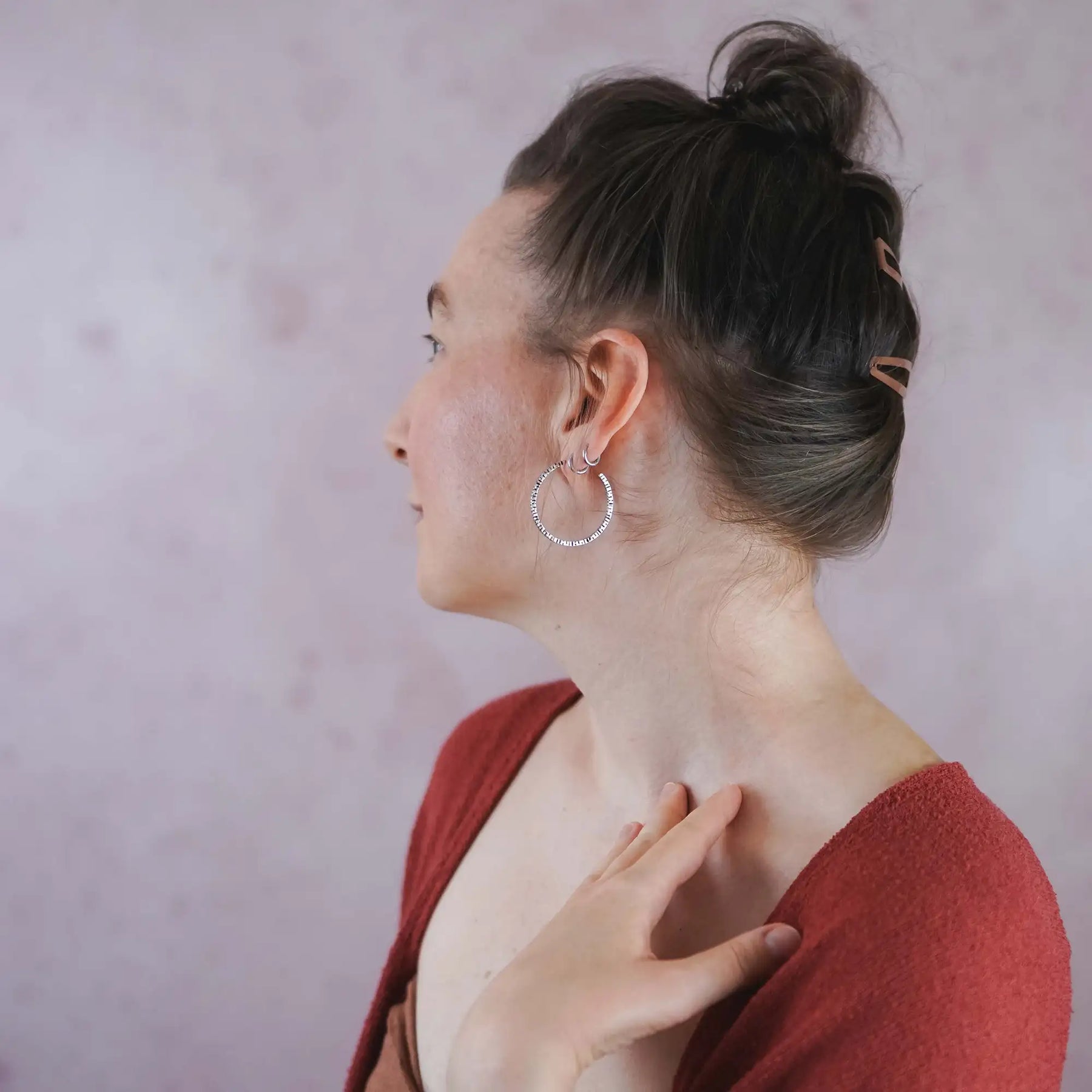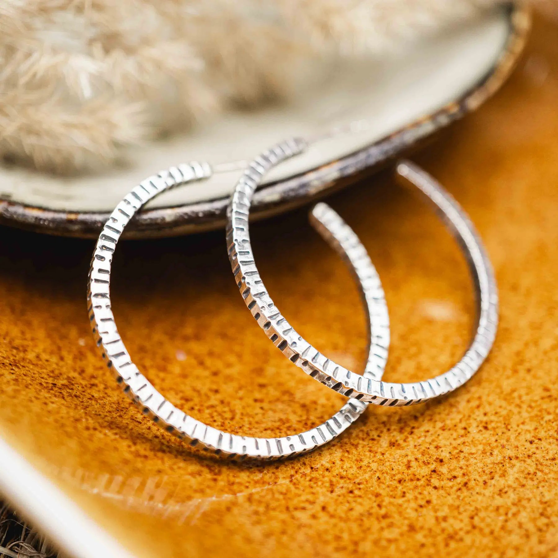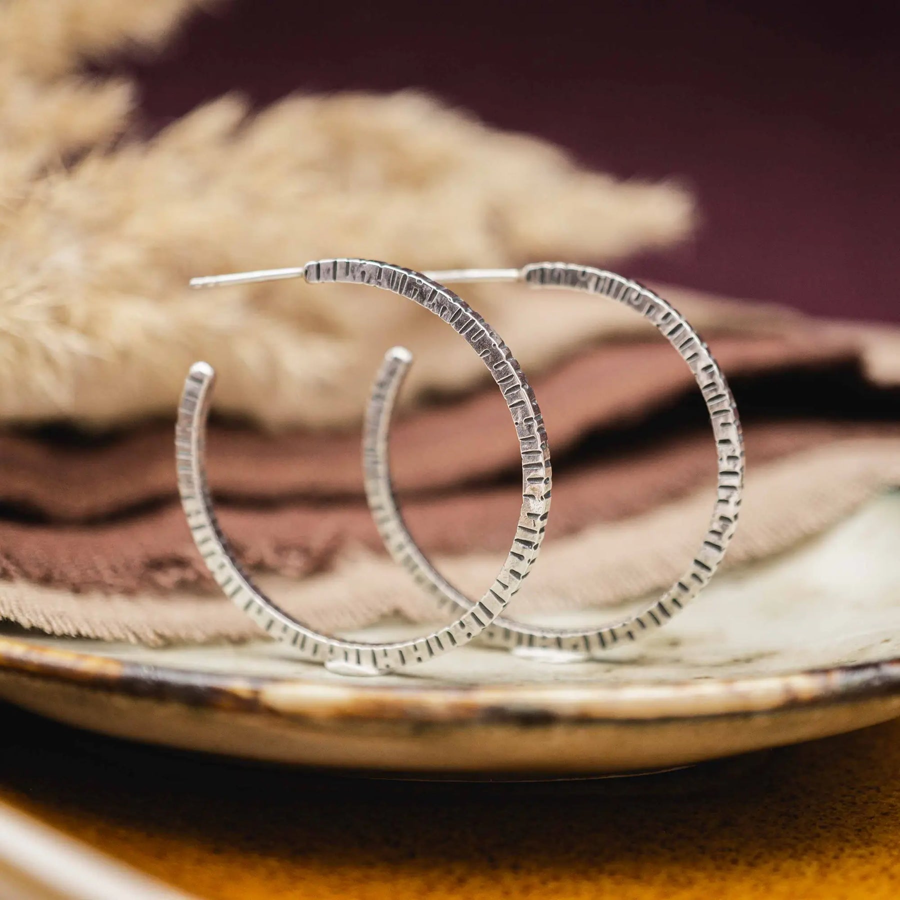 Ein klassisches Must have mit neuem Twist! Creolen Ohrringe aus 925 Silber – handgefertigt und mit einer rustikalen Birkenrinden-Textur versehen.