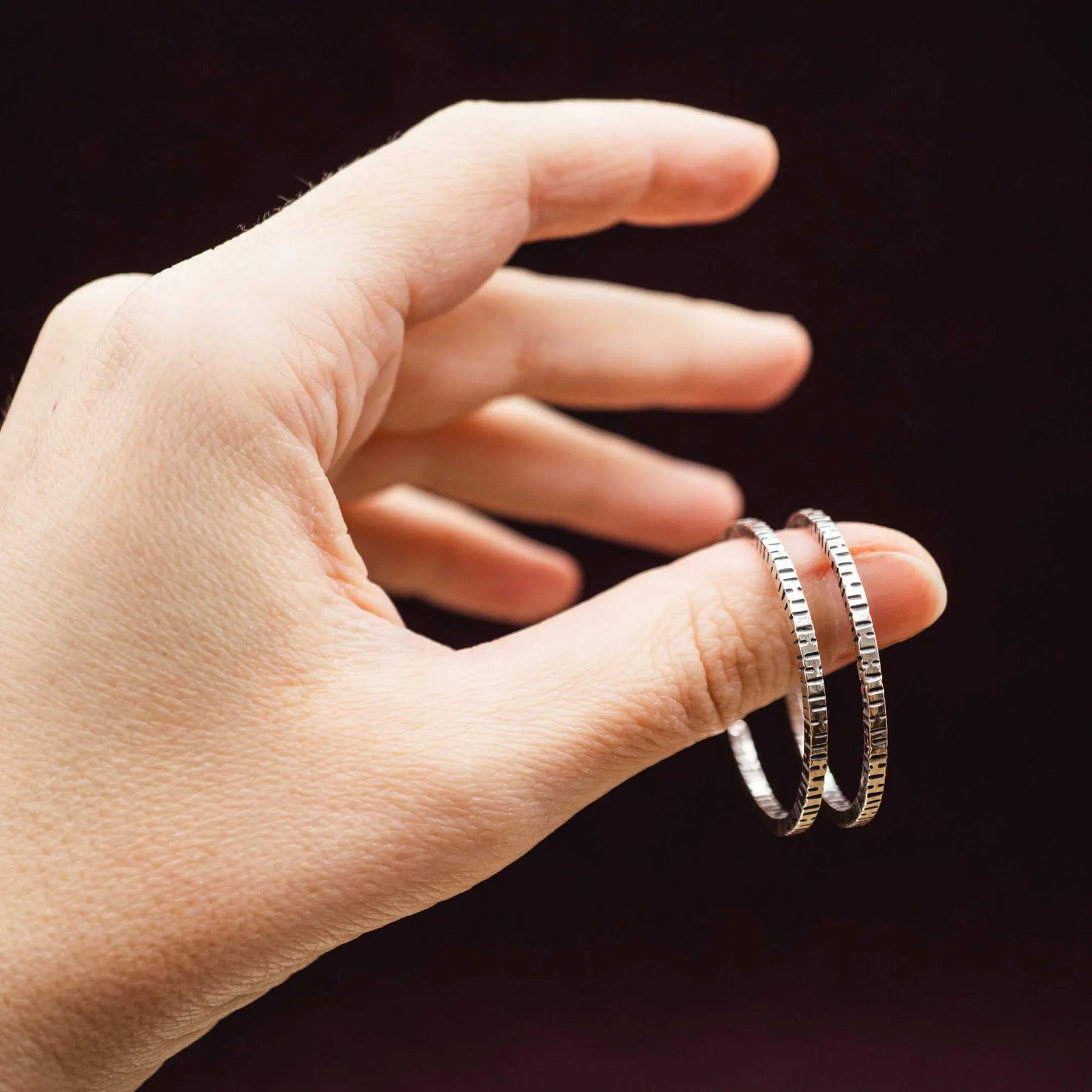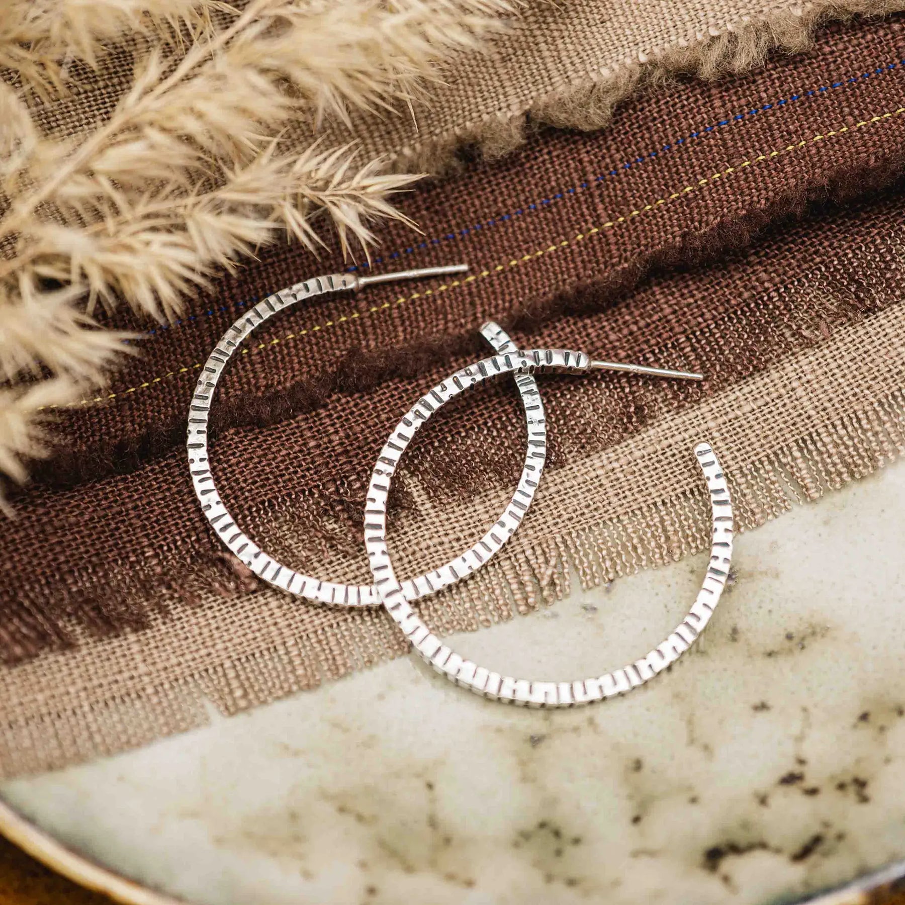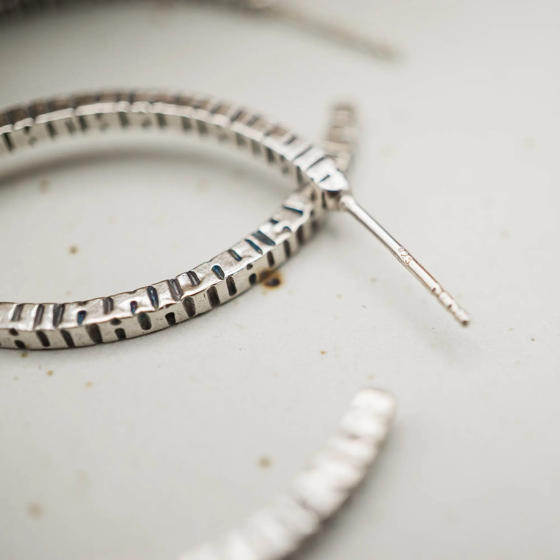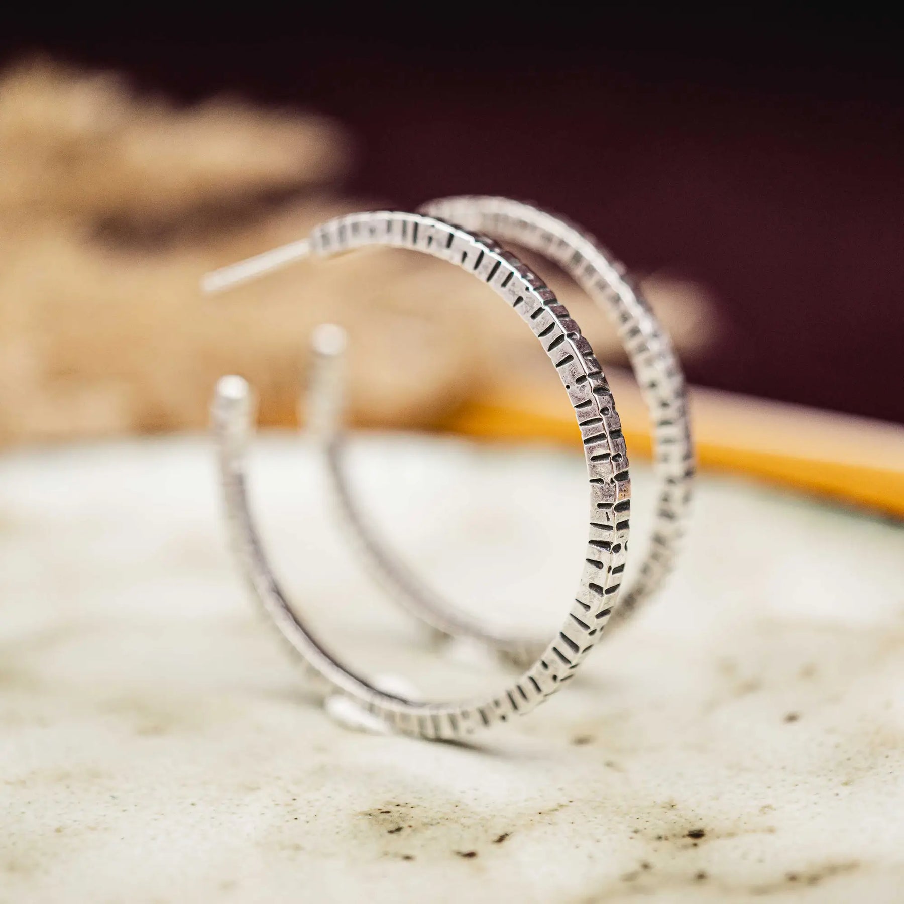 Mittelgroße, silberne Creolen, handgefertigt mit organisch gestrichelter Rinden Textur aus Silber 925