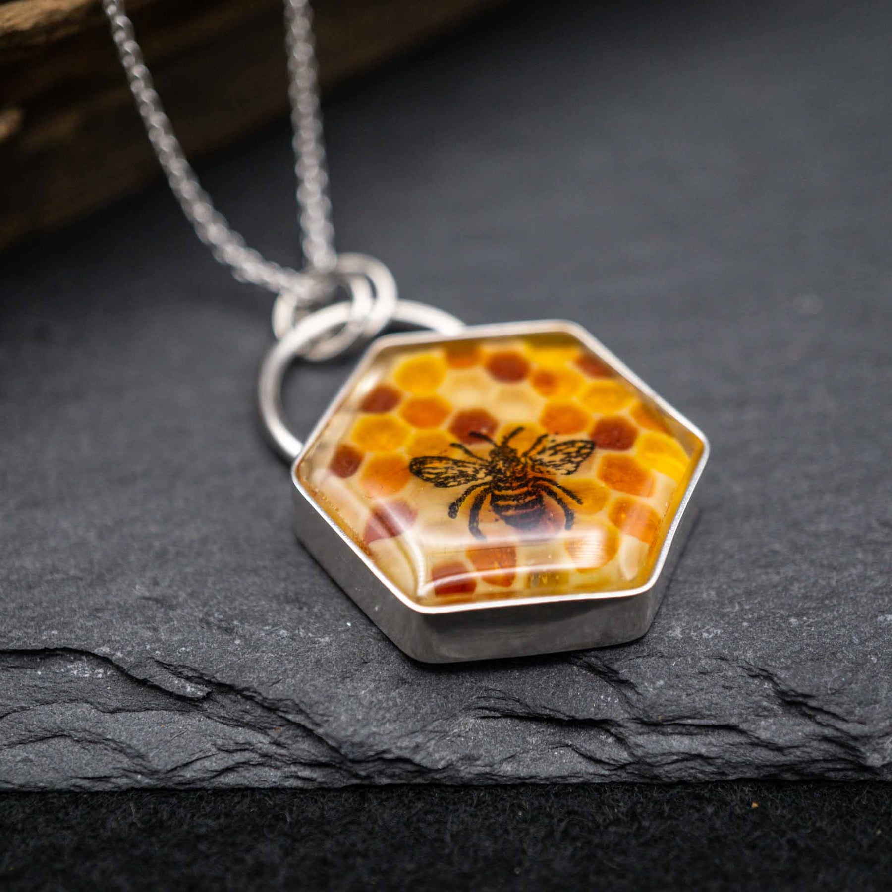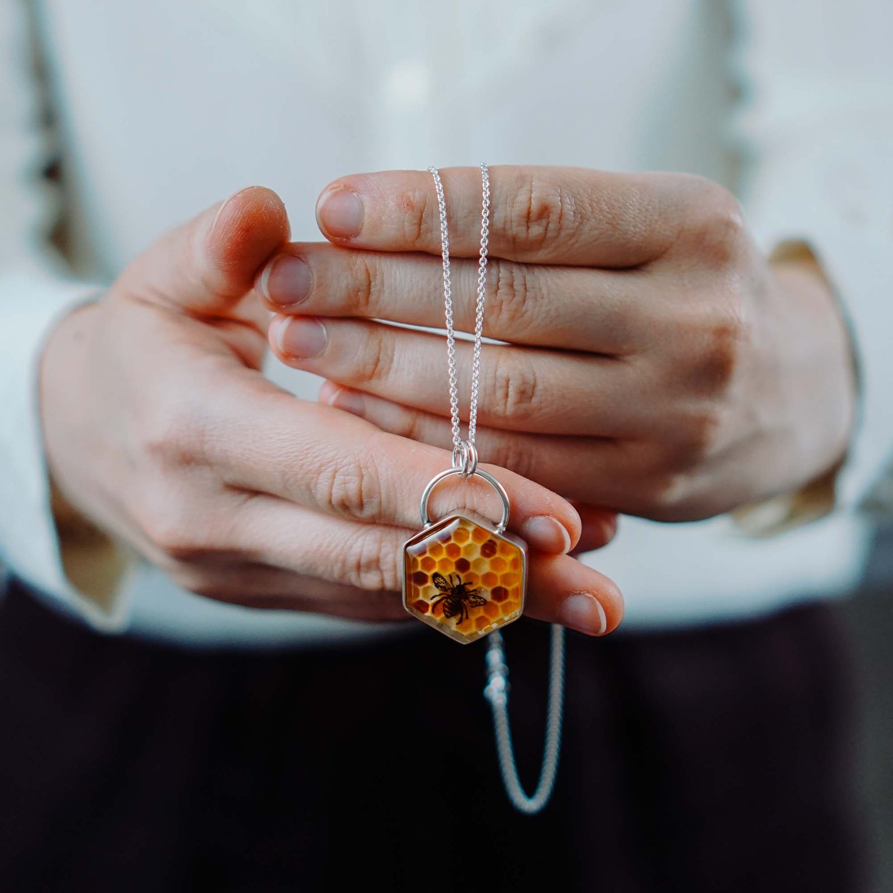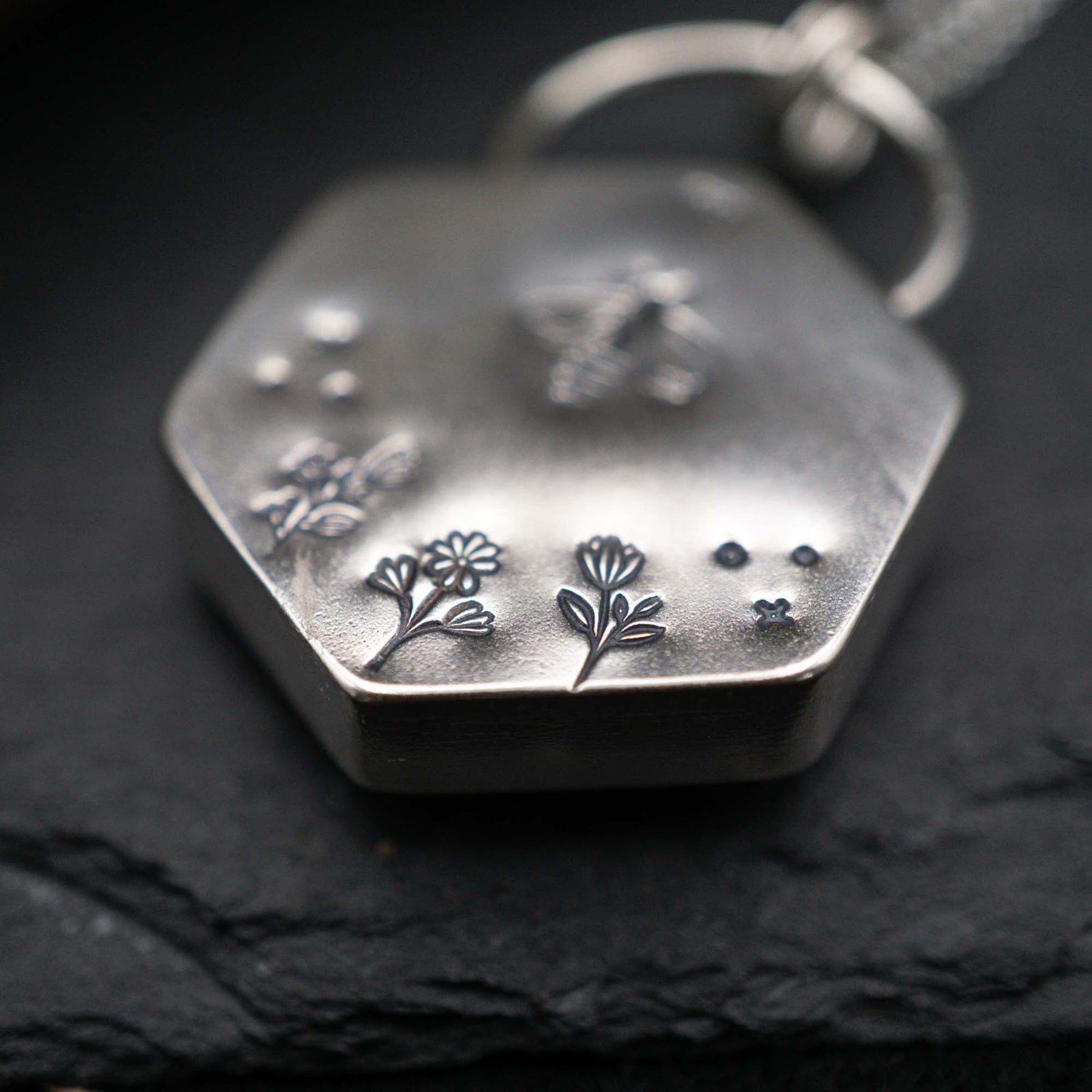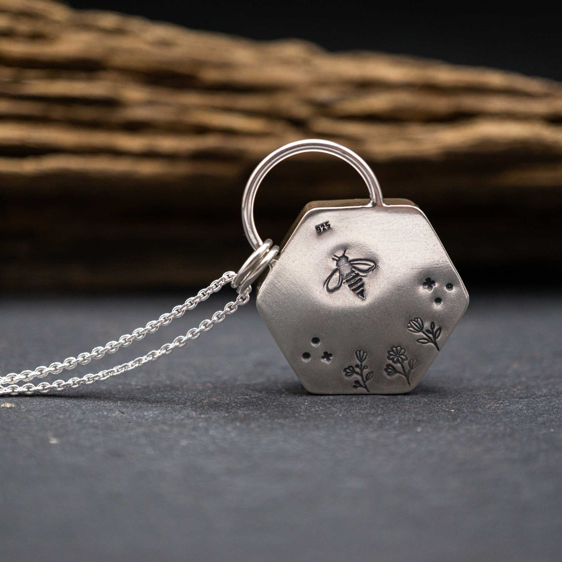 Der wabenförmige Anhänger ist eingefasst in matt poliertem Echtsilber. Auf der Rückseite versteckt sich ein kleiner, rustikal ins Metall geschlagener Blumengarten mit Bienchen.