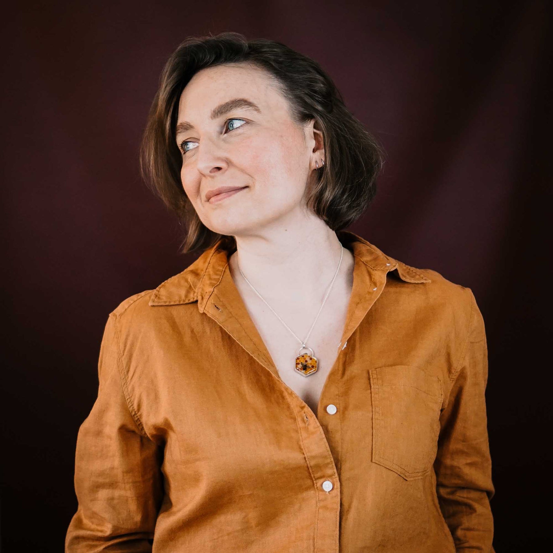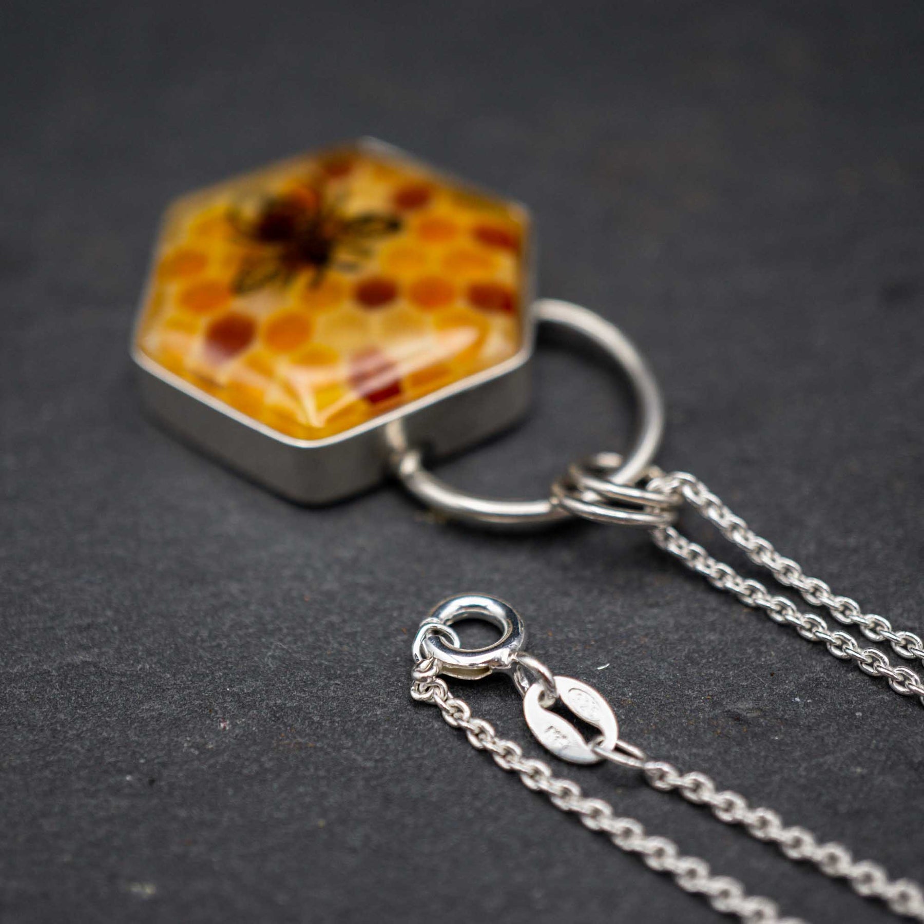 Kette aus Silber mit Honigwaben in gelb und orange mit einer schwarzen Biene. Die von Hand modellierte Honigwabe sitzt in einer silbernen Fassung aus 925 Sterling Silber. Die Rückseite des mittelgroßen Anhängers zieren ins Metall geschlagene Blumen und eine Biene.