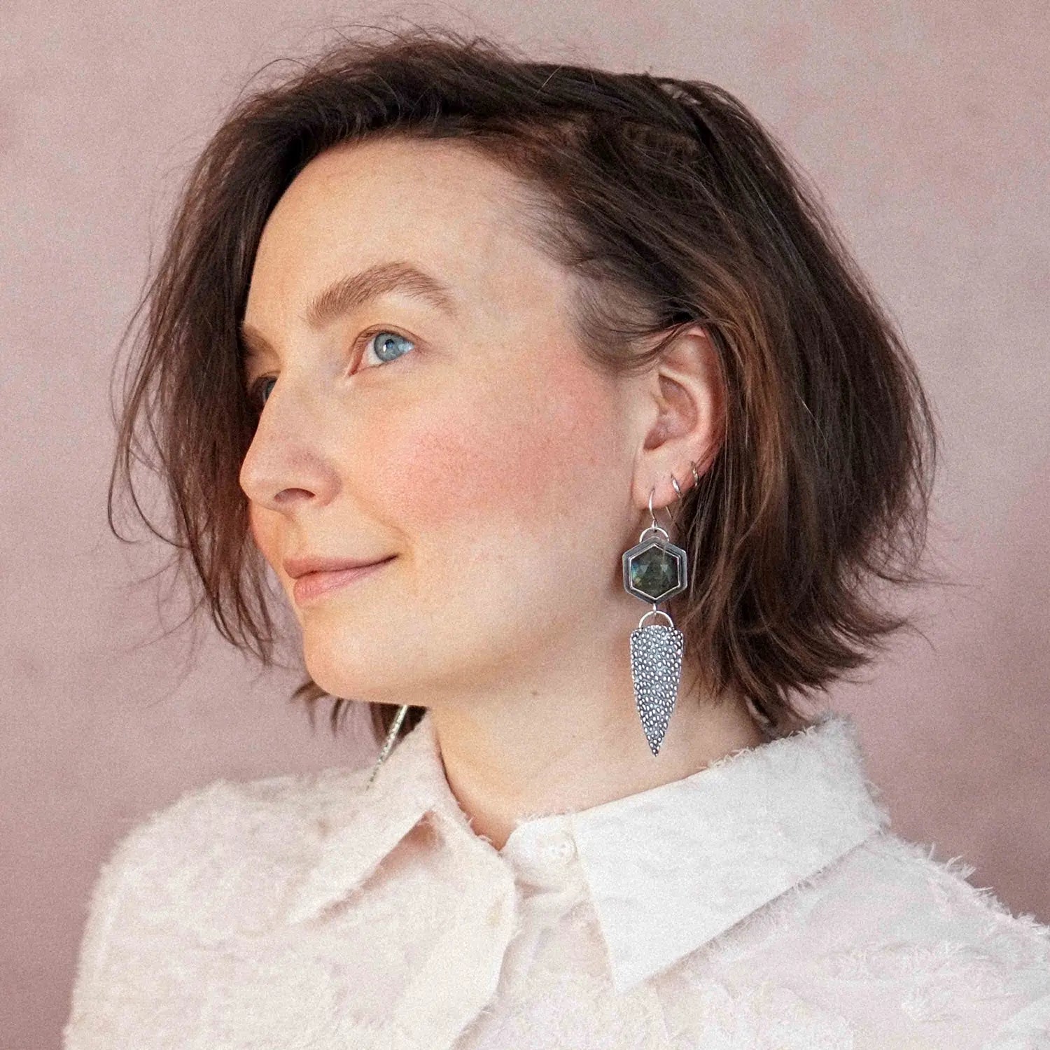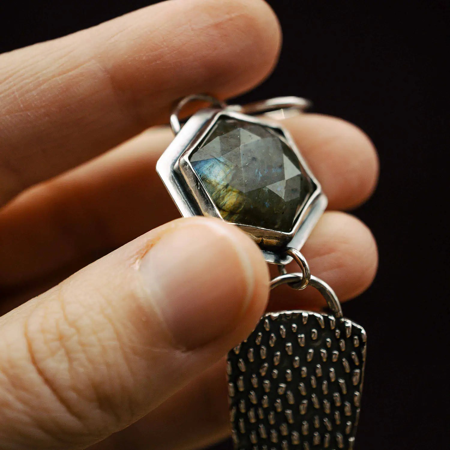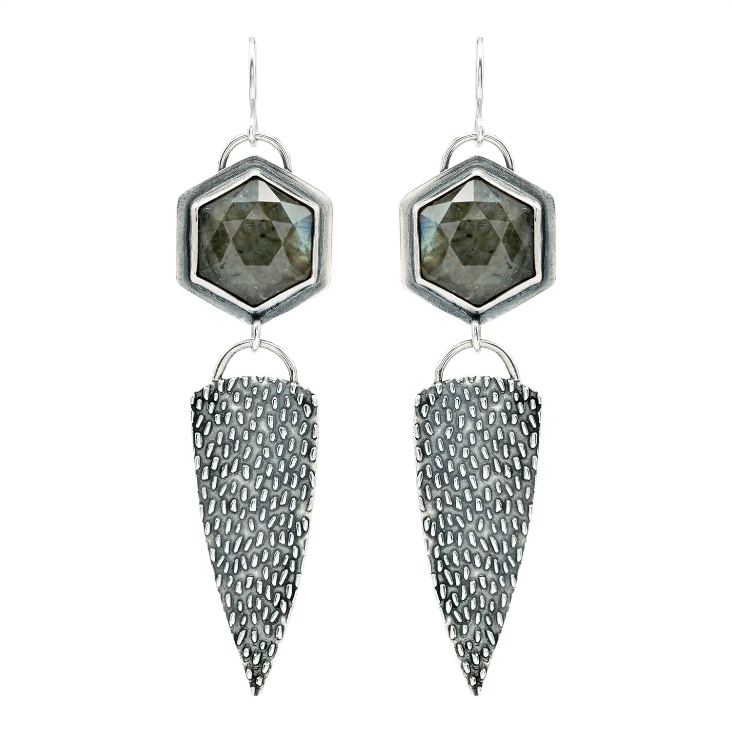 Lange Statement Ohrringe aus Silber 925 mit grauem Labradorit und einem Dreieck aus Silber mit Regen Textur.