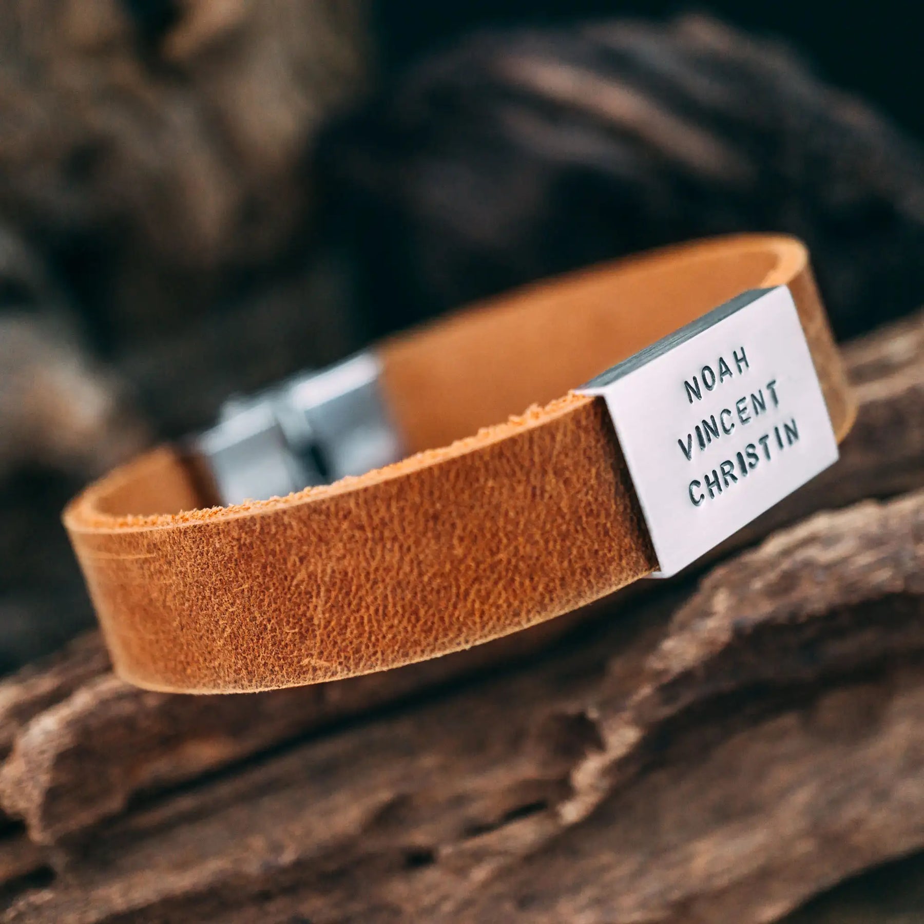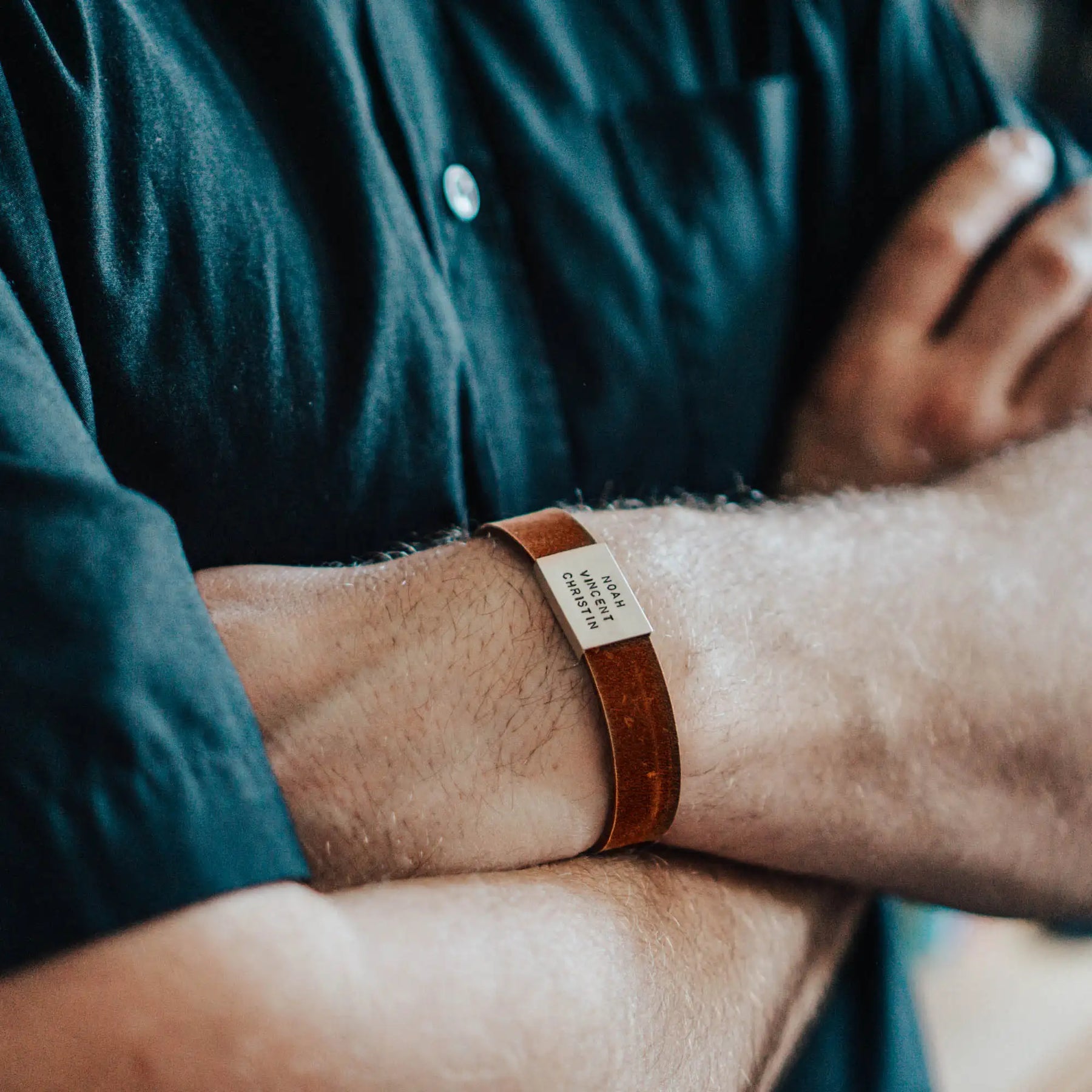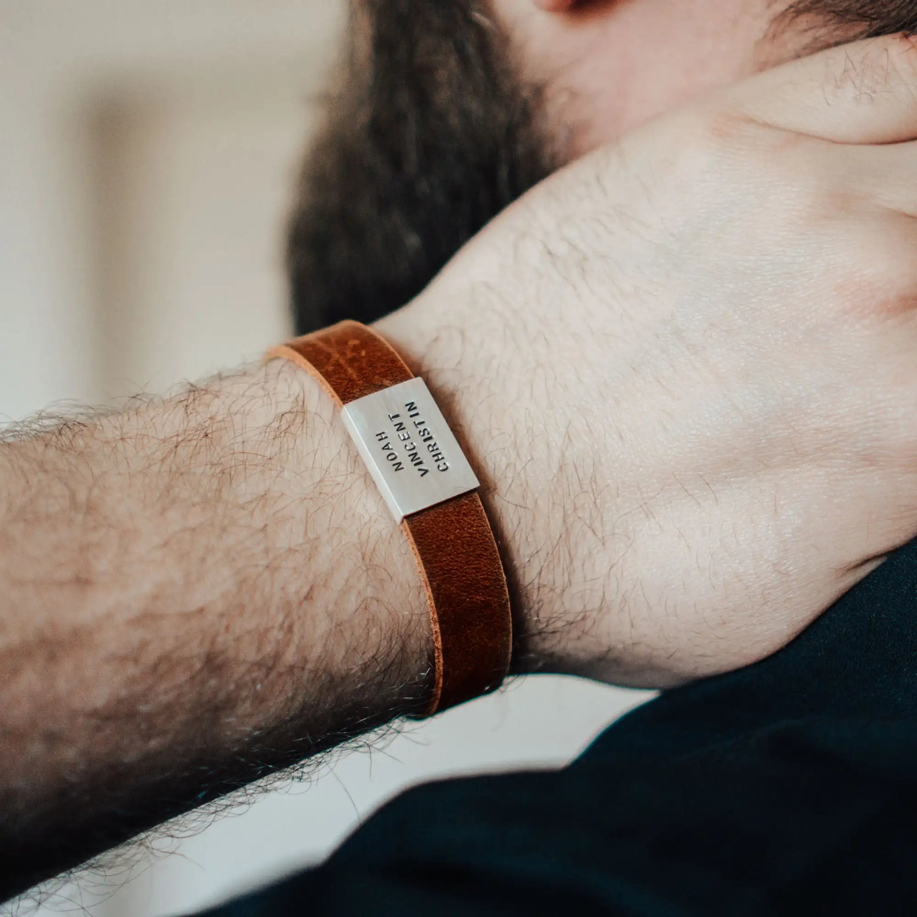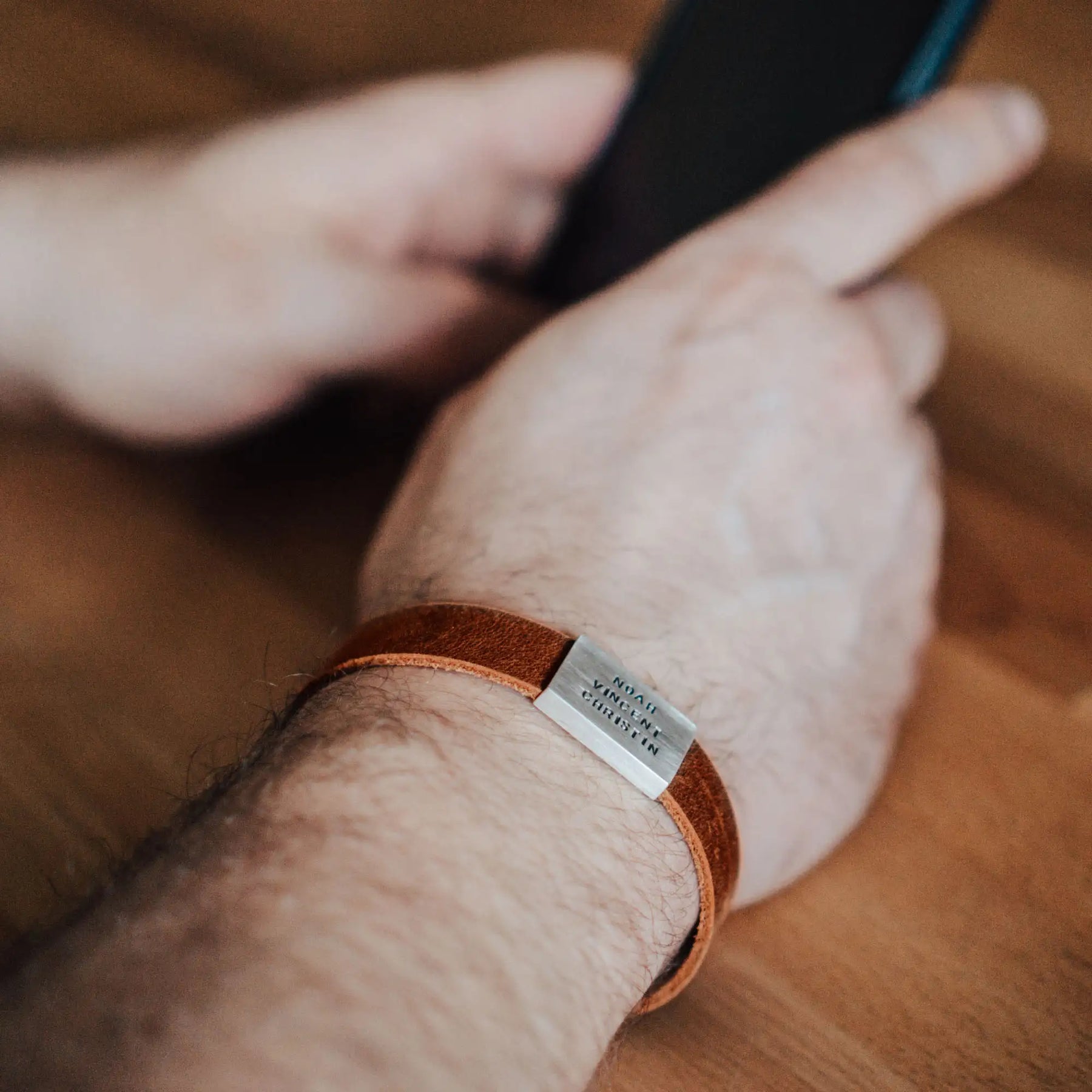 A leather bracelet made of strong terracotta/cognac-colored cowhide, decorated with a matt polished sliding bead in 925 real silver with the names of your loved ones engraved or a text of your choice!