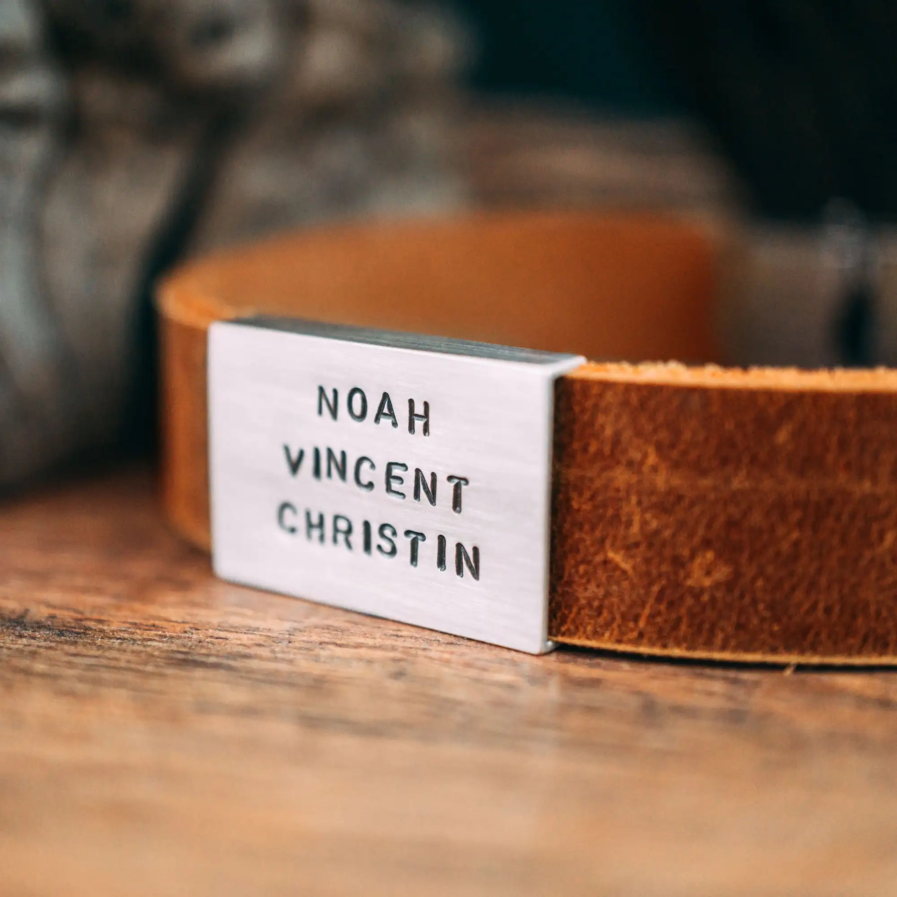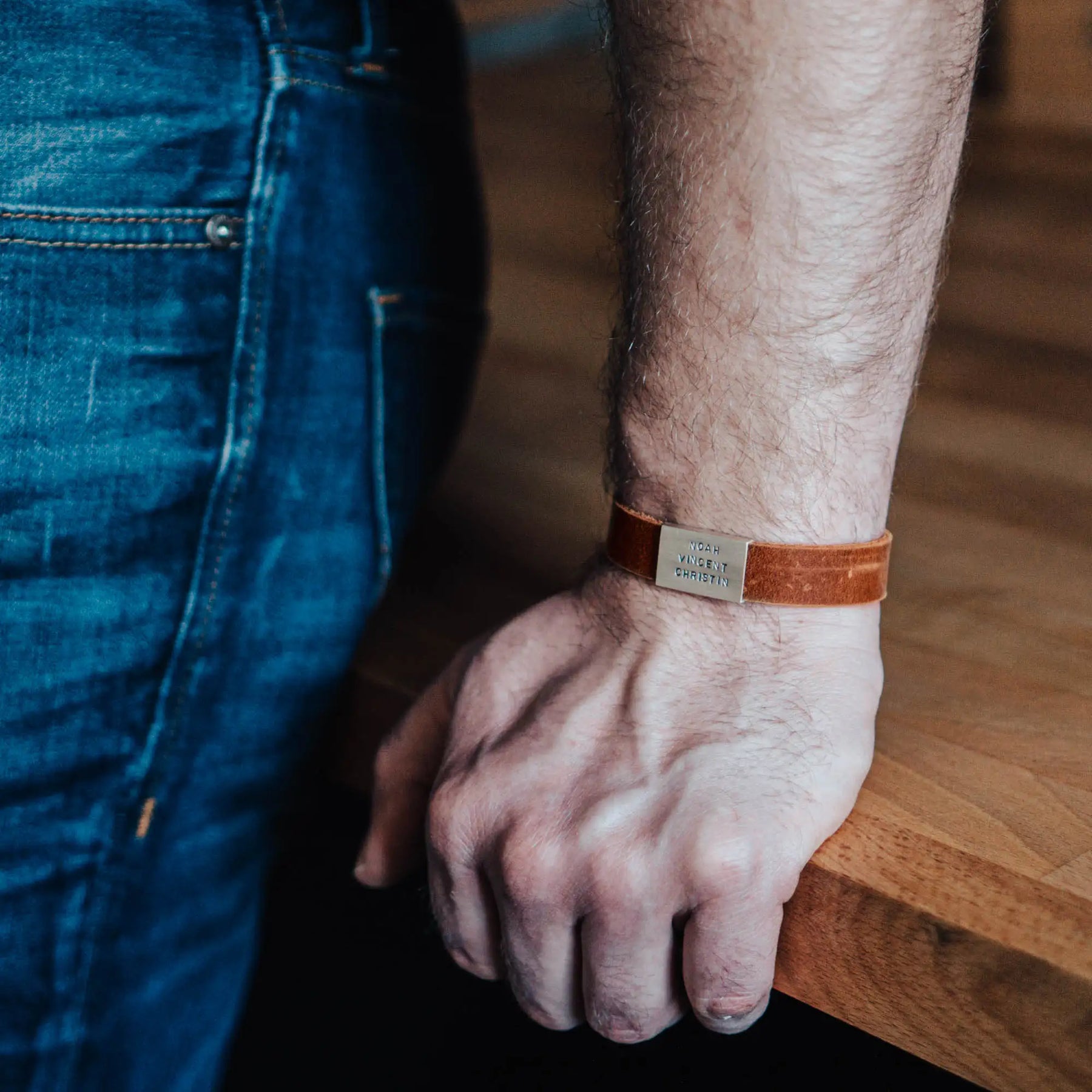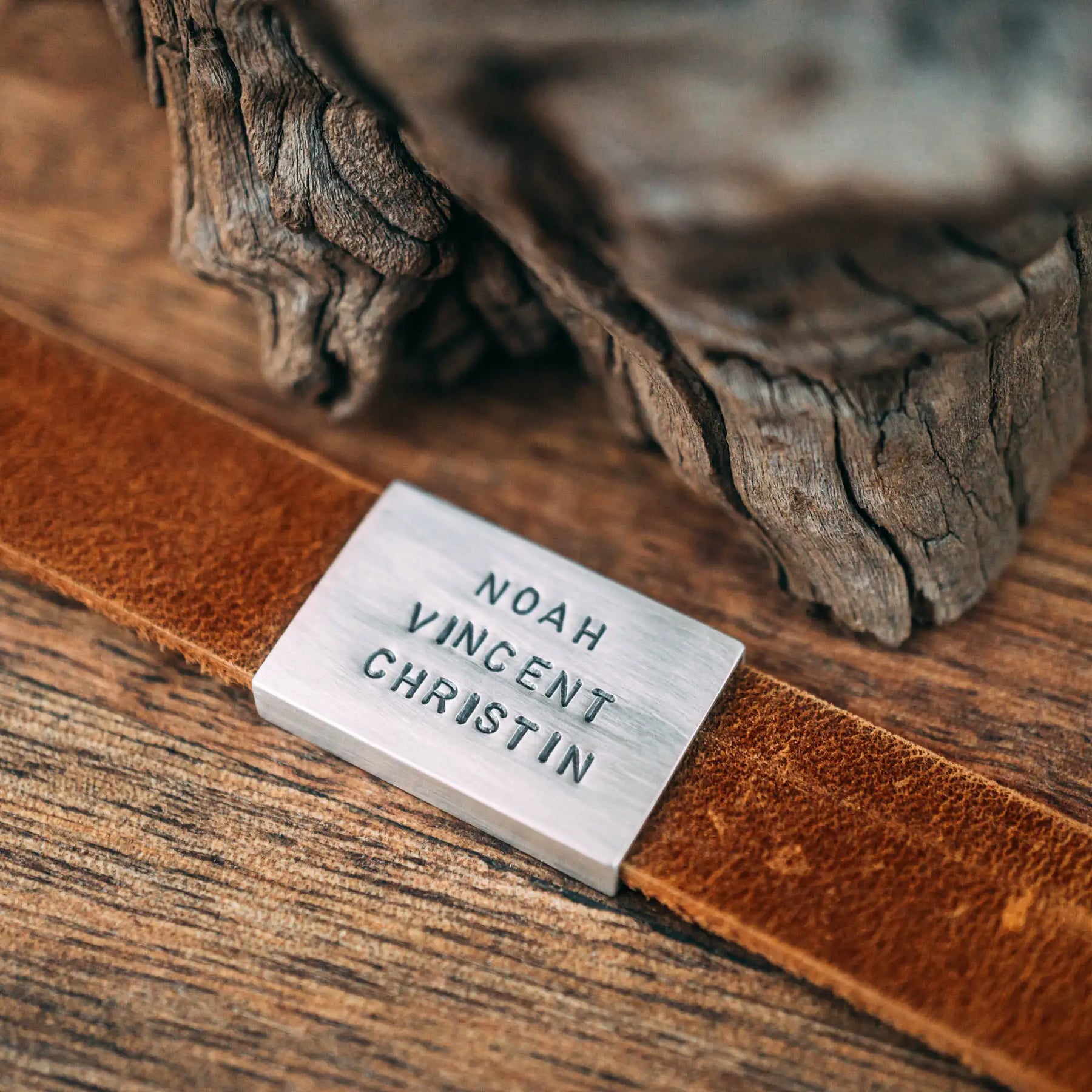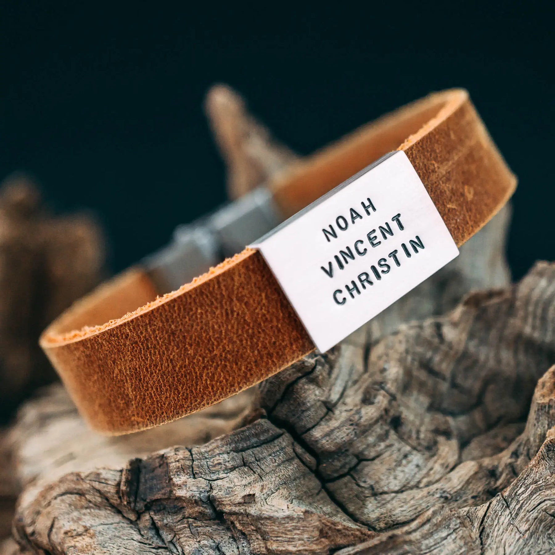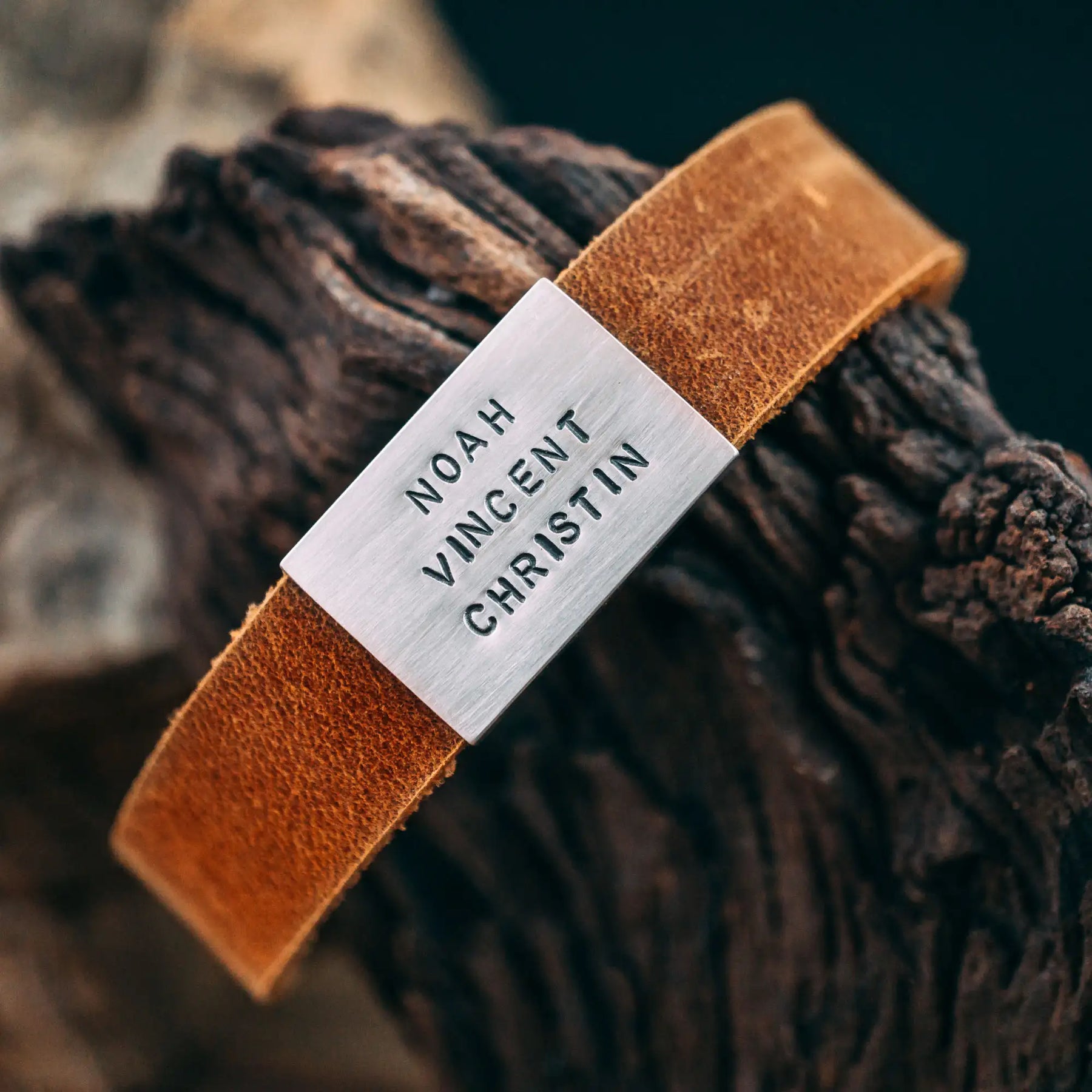 A leather bracelet made of strong terracotta/cognac-colored cowhide, decorated with a matt polished sliding bead in 925 real silver with the names of your loved ones engraved or a text of your choice!